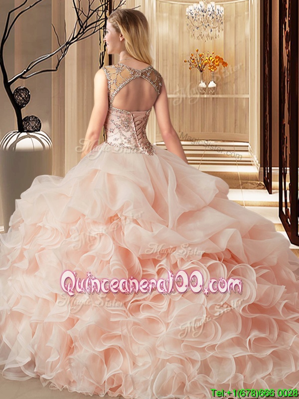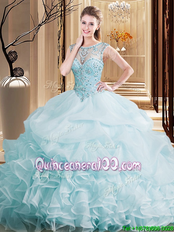 Neckline : ScoopShown Color : Light BlueSilhouette : Ball GownsSleeve Length : sleevelessBack Detail : Lace upFabric : OrganzaEmbellishment : Beading,Ruffles,Pick UpsOccasion : Military Ball,Sweet 16,QuinceaneraSeason : Spring,Summer,Fall,Winter