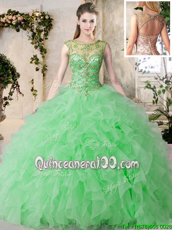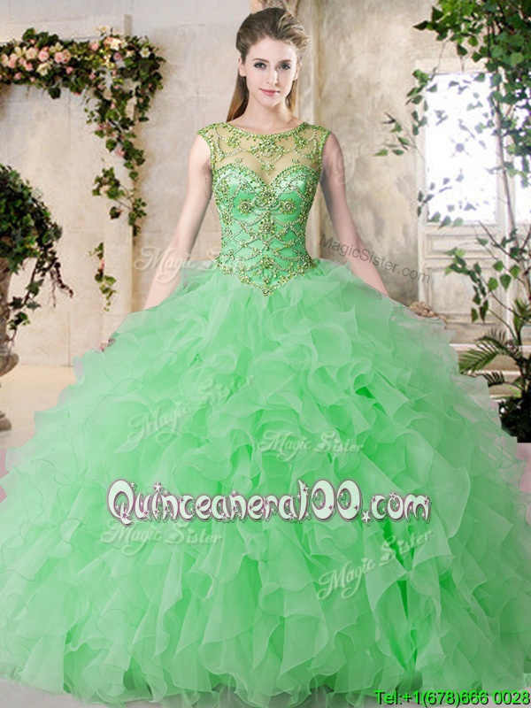 Neckline : ScoopShown Color : GreenSilhouette : Ball GownsSleeve Length : sleevelessHemline : floor lengthBack Detail : Lace upFabric : OrganzaEmbellishment : Beading,RufflesOccasion : Military Ball,Sweet 16,QuinceaneraSeason : Spring,Summer,Fall,Winter