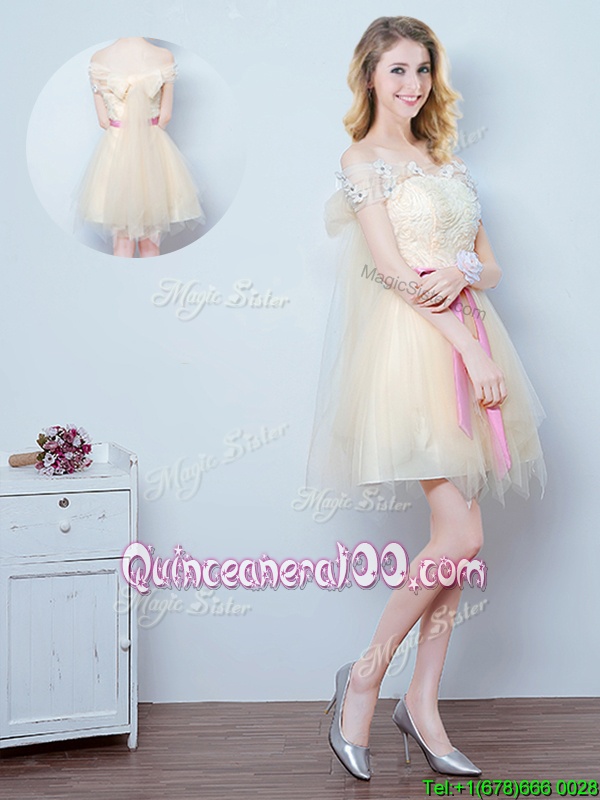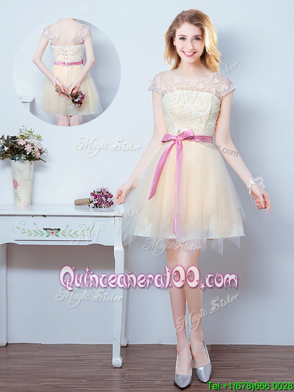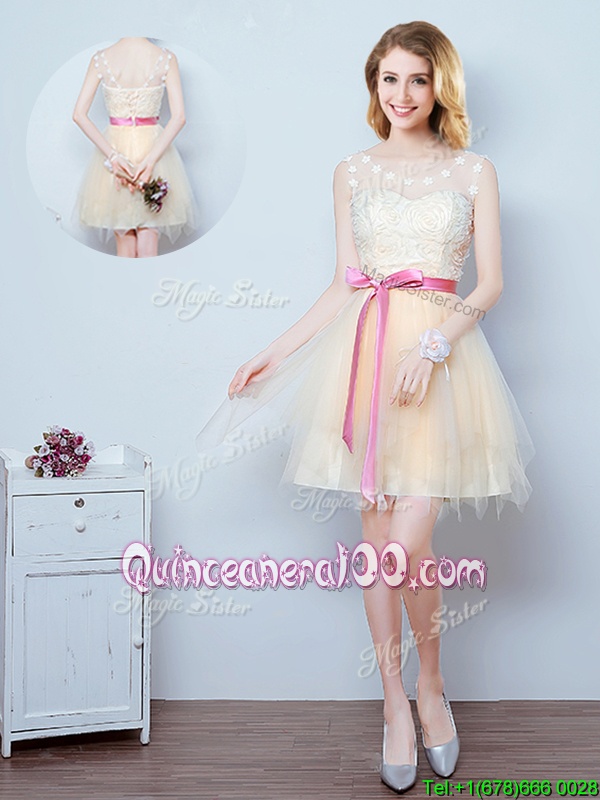 Neckline : ScoopShown Color : ChampagneSilhouette : A-lineSleeve Length : sleevelessHemline : mini lengthBack Detail : Lace upFabric : TulleEmbellishment : Lace,Appliques,Ruffles,BowknotOccasion : Prom,Party,Wedding PartySeason : Spring,Summer,Fall