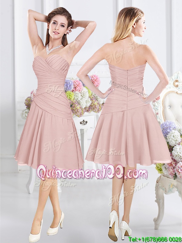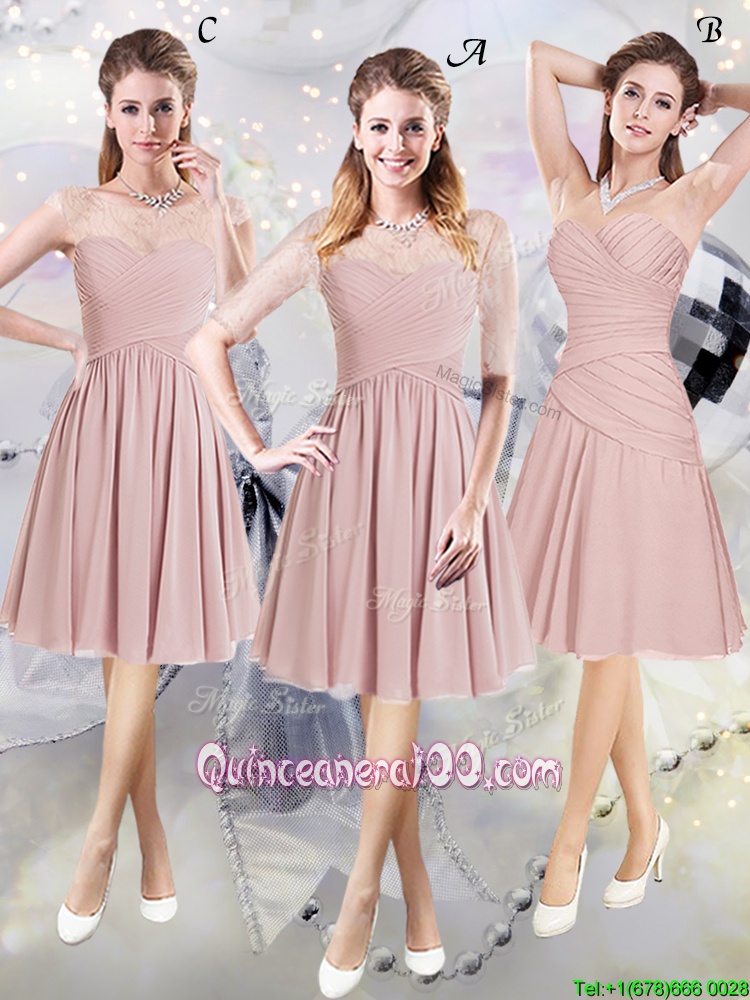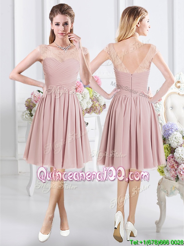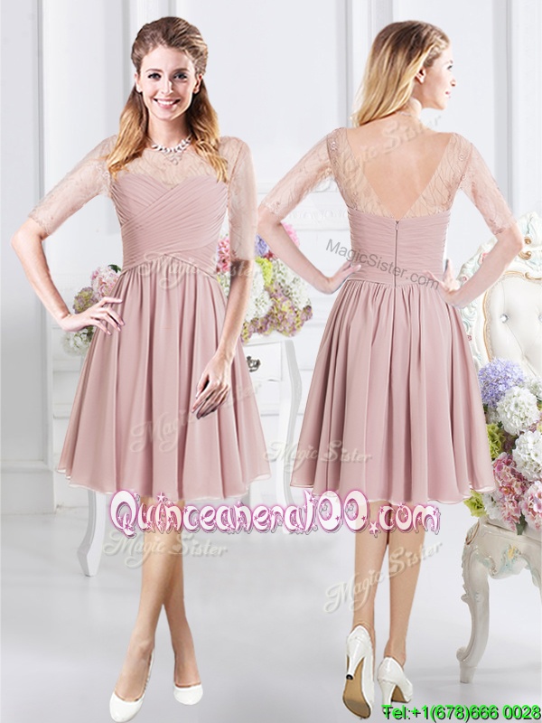 Romantic Scoop Half Sleeves Vestidos de Damas Knee Length Lace and Ruching Pink Chiffon