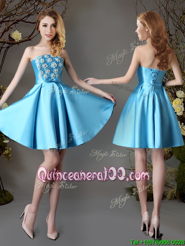 Neckline : StraplessShown Color : Baby BlueSilhouette : A-lineSleeve Length : sleevelessHemline : mini lengthBack Detail : Lace upFabric : SatinEmbellishment : Appliques,BowknotOccasion : Prom,PartySeason : Spring,Summer,Fall