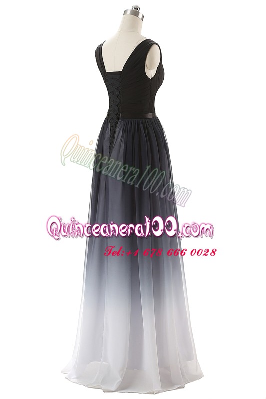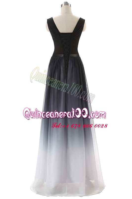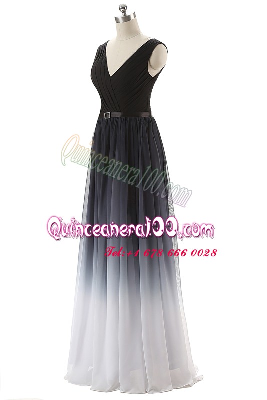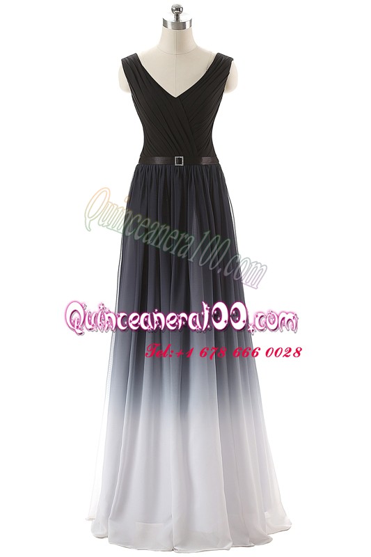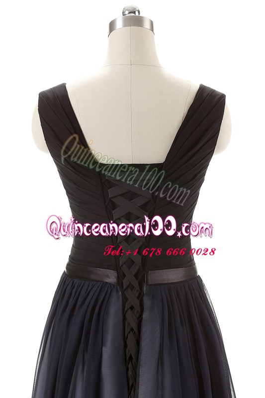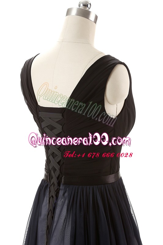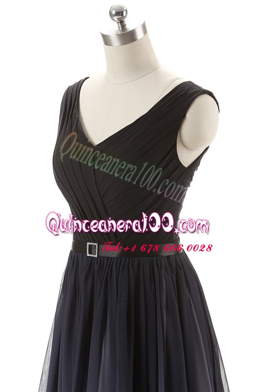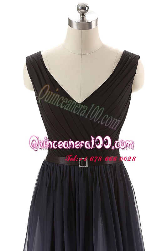 Neckline : V-neckShown Color : BlackSilhouette : EmpireSleeve Length : sleevelessHemline : floor lengthBack Detail : Lace upFabric : ChiffonEmbellishment : Ruching,BeltOccasion : Prom,PartySeason : Spring,Summer,Fall,Winter