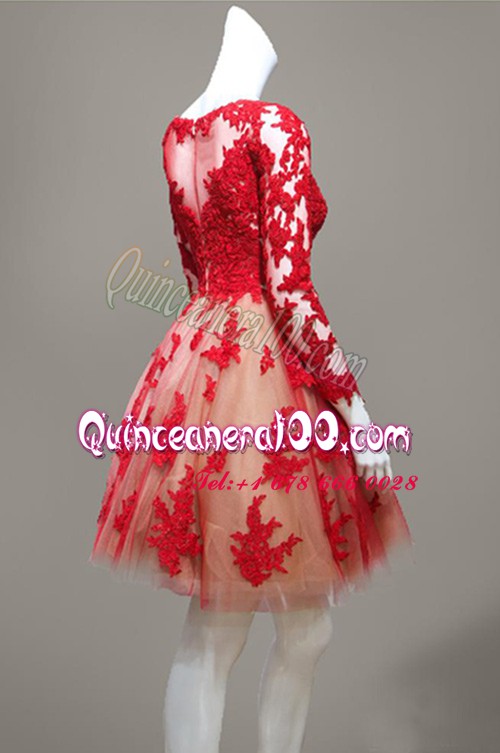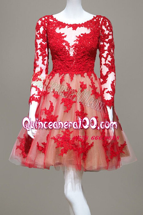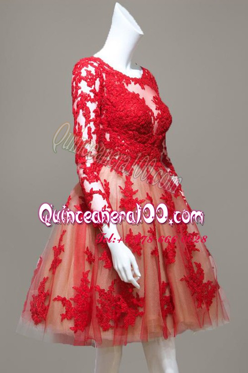 Neckline : ScoopShown Color : RedSilhouette : A-lineSleeve Length : long sleevesHemline : knee lengthBack Detail : ZipperFabric : LaceEmbellishment : AppliquesOccasion : PromSeason : Spring,Summer