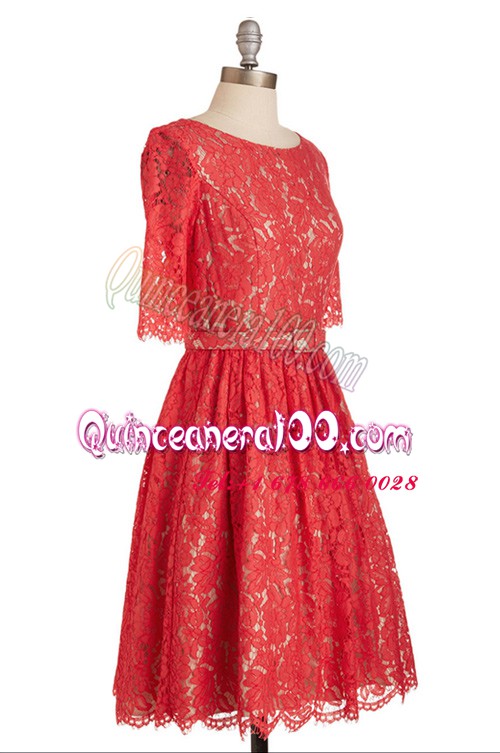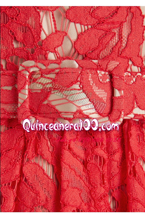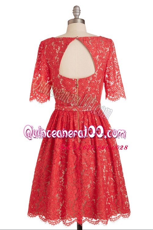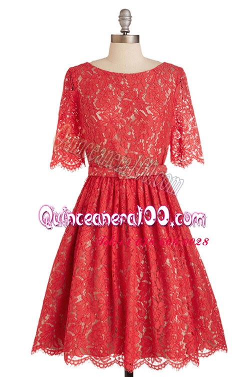 Neckline : ScoopShown Color : RedSilhouette : A-lineSleeve Length : short sleevesHemline : knee lengthBack Detail : ZipperFabric : LaceEmbellishment : BeltOccasion : PromSeason : Spring,Summer