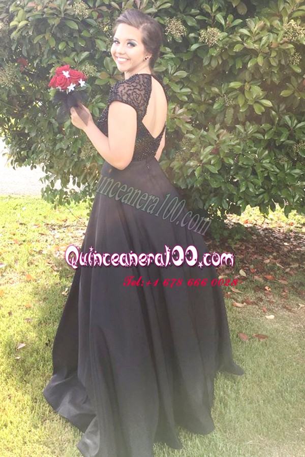 Neckline : ScoopShown Color : BlackSilhouette : A-lineSleeve Length : cap sleevesHemline : floor lengthBack Detail : BacklessFabric : SatinEmbellishment : BeadingOccasion : Prom,PartySeason : Spring,Summer,Fall