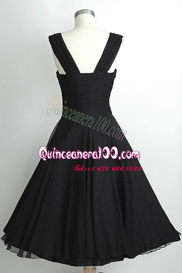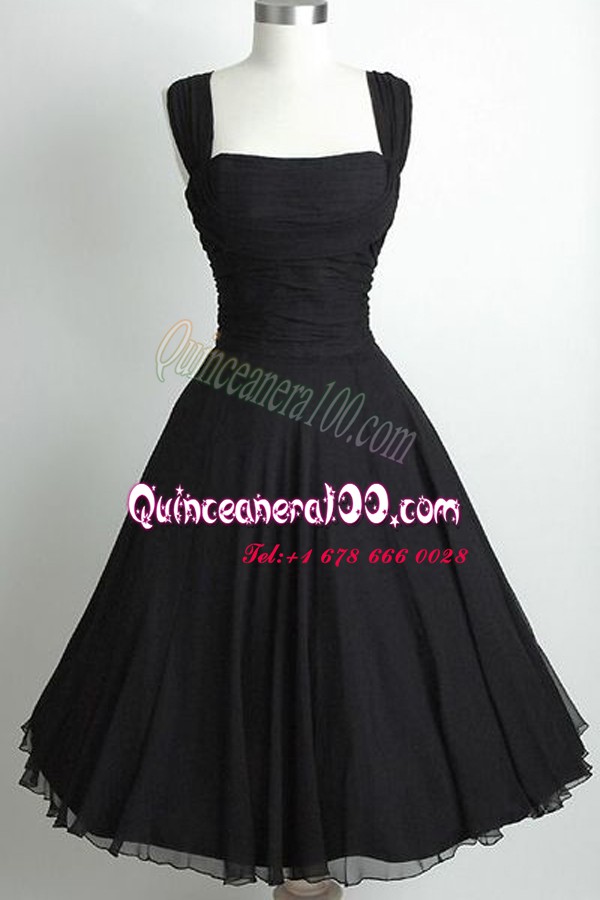 Neckline : SquareShown Color : BlackSilhouette : A-lineSleeve Length : sleevelessHemline : tea lengthBack Detail : Side zipperFabric : ChiffonEmbellishment : RuchingOccasion : Prom,PartySeason : Spring,Summer,Fall