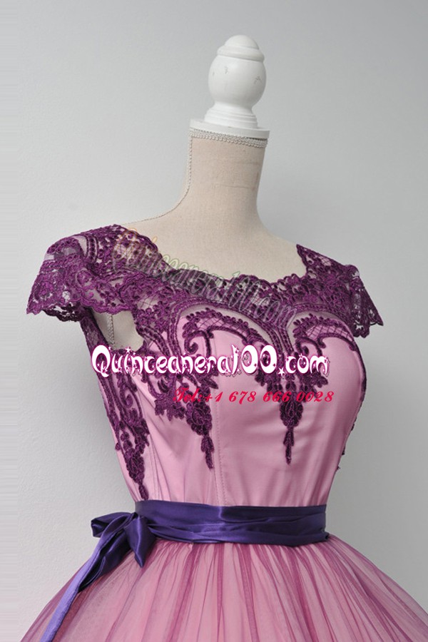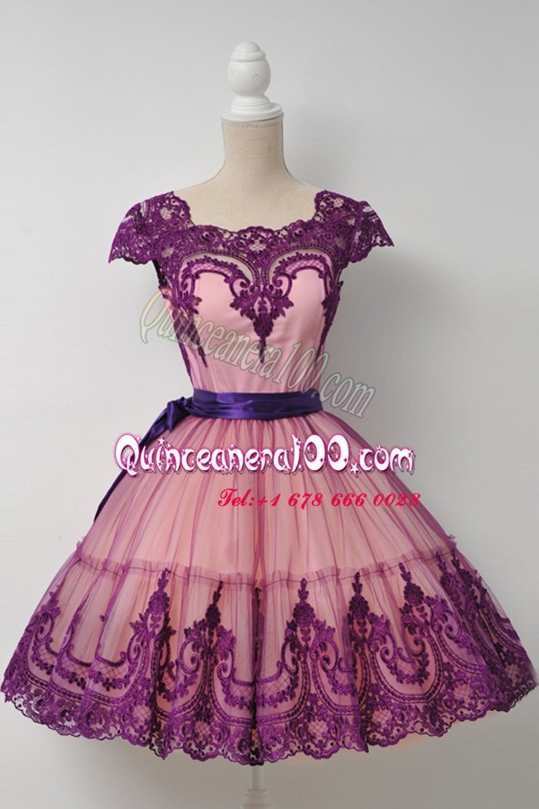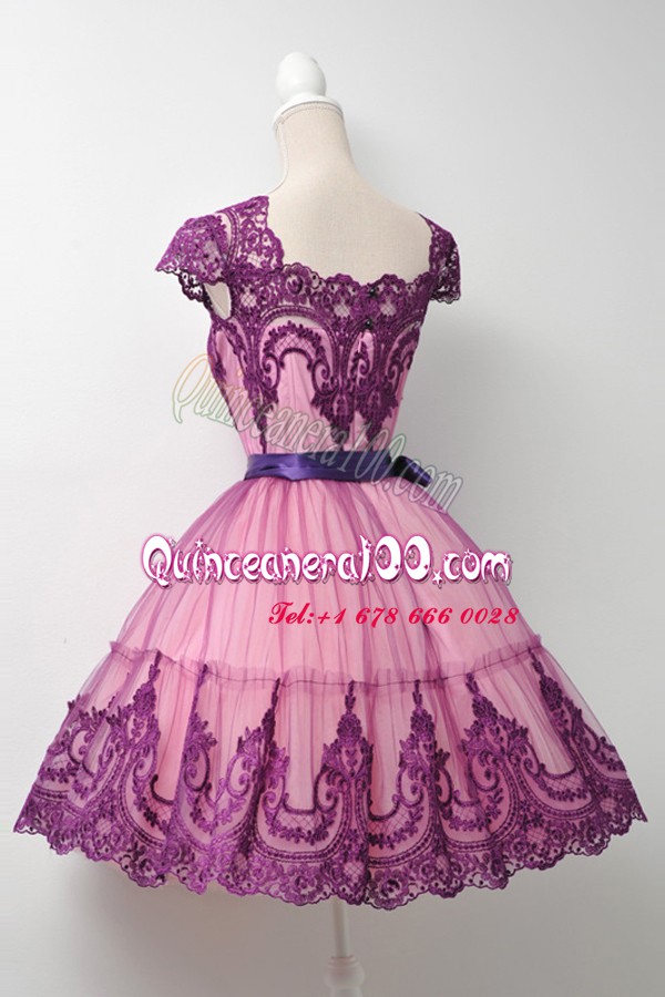 Neckline : SquareShown Color : PurpleSilhouette : Ball GownsSleeve Length : cap sleevesHemline : mini lengthBack Detail : ZipperFabric : TulleEmbellishment : BeltOccasion : Prom,PartySeason : Spring,Summer,Fall