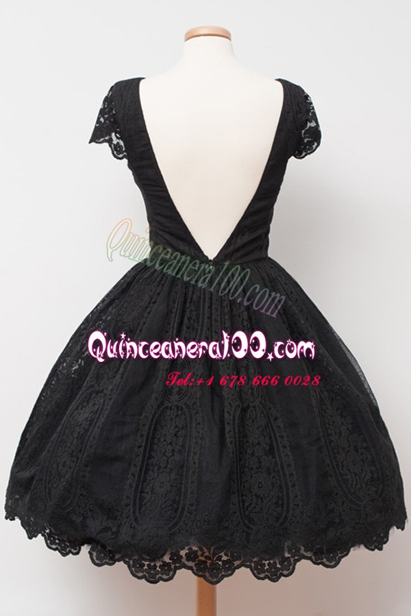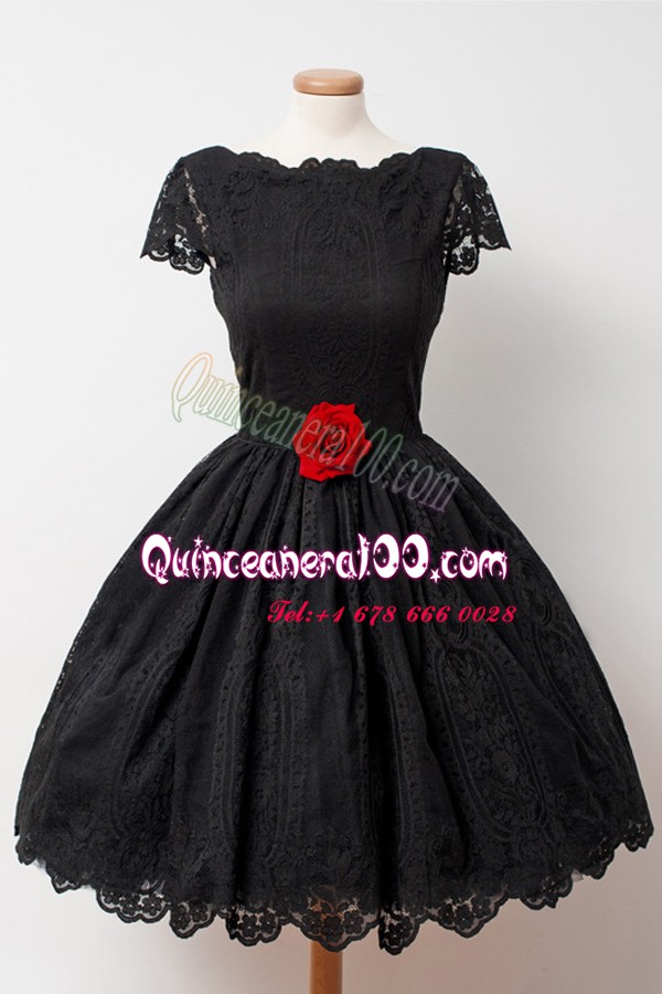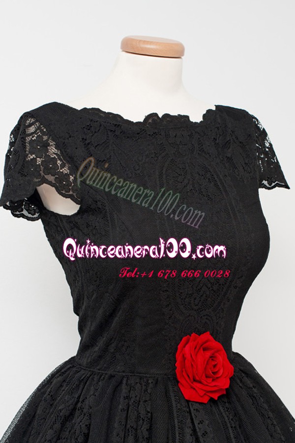 Neckline : BateauShown Color : BlackSilhouette : Ball GownsSleeve Length : cap sleevesHemline : knee lengthBack Detail : BacklessFabric : LaceEmbellishment : Hand Made FlowerOccasion : Prom,PartySeason : Spring,Summer,Fall