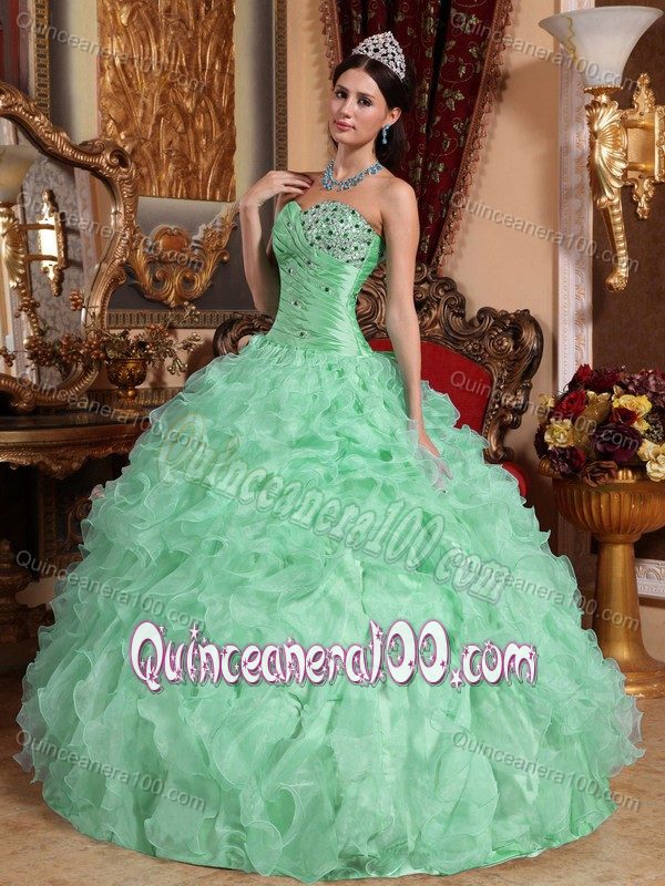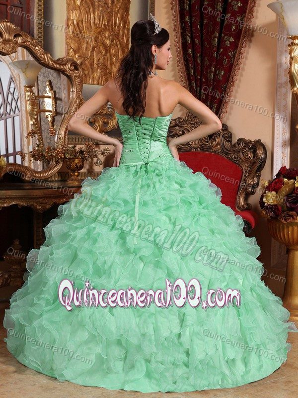 Neckline : SweetheartShown Color : Green,Apple GreenSilhouette : Ball GownsSleeve Length : sleevelessHemline : floor lengthBack Detail : Lace upFabric : OrganzaEmbellishment : Beading,Ruffled Layers,RuchingOccasion : Sweet 16,QuinceaneraSeason : Spring,Summer,Fall,Winter