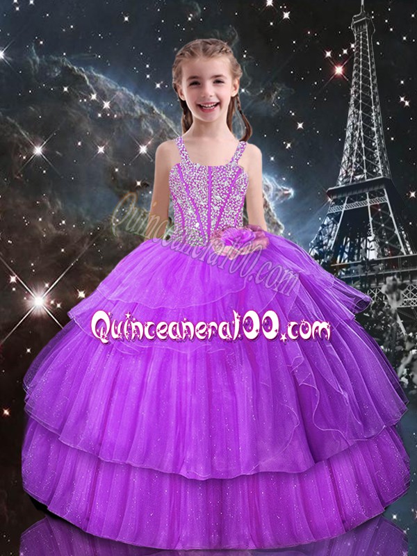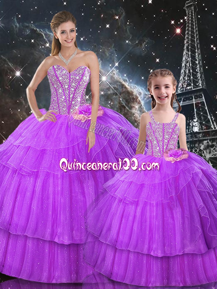 Neckline : SweetheartShown Color : PurpleSilhouette : Ball GownsSleeve Length : sleevelessHemline : floor lengthBack Detail : Lace upFabric : Organza,TulleEmbellishment : Beading,Ruffled LayersOccasion : Military Ball,Sweet 16,QuinceaneraSeason : Spring,Summer,Fall,Winter