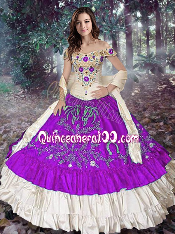 Neckline : Off the shoulderShown Color : Eggplant PurpleSilhouette : Ball GownsSleeve Length : sleevelessHemline : floor lengthBack Detail : Lace upFabric : TaffetaEmbellishment : Embroidery,Ruffled LayersOccasion : Military Ball,Sweet 16,QuinceaneraSeason : Spring,Summer,Fall,Winter