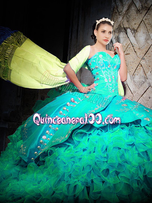 Neckline : SweetheartShown Color : TurquoiseSilhouette : Ball GownsSleeve Length : sleevelessHemline : with trainBack Detail : Lace upFabric : OrganzaEmbellishment : Embroidery,RufflesOccasion : Military Ball,Sweet 16,QuinceaneraSeason : Spring,Summer,Fall,Winter