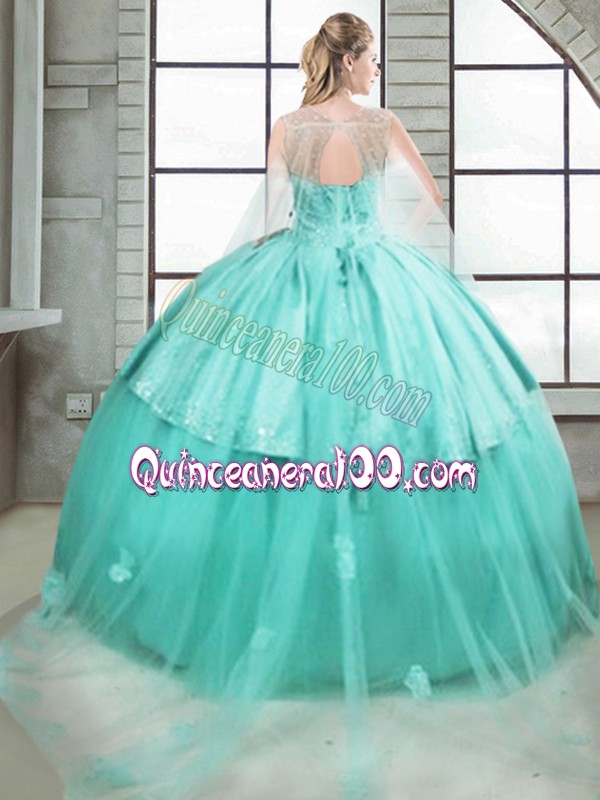 Neckline : ScoopShown Color : TurquoiseSilhouette : Ball GownsSleeve Length : sleevelessBack Detail : Lace upFabric : TulleEmbellishment : Beading,RuchingOccasion : Military Ball,Sweet 16,QuinceaneraSeason : Spring,Summer,Fall,Winter