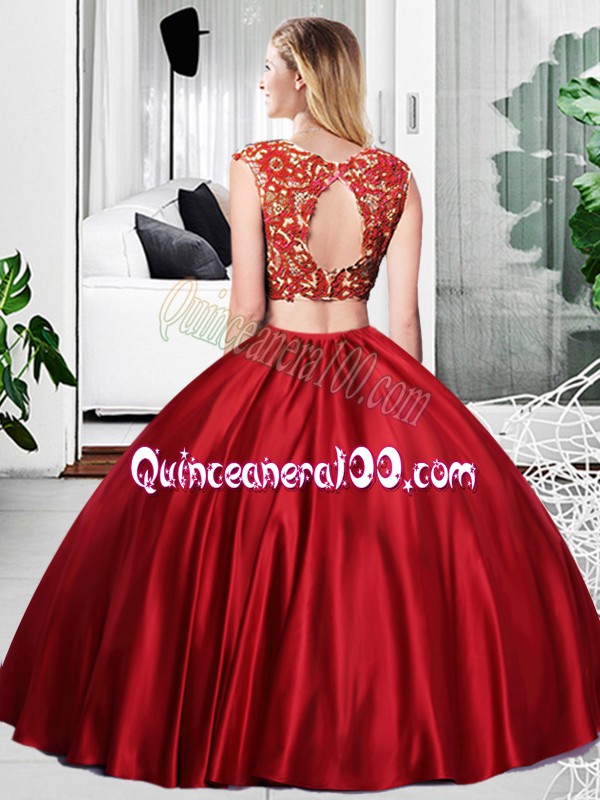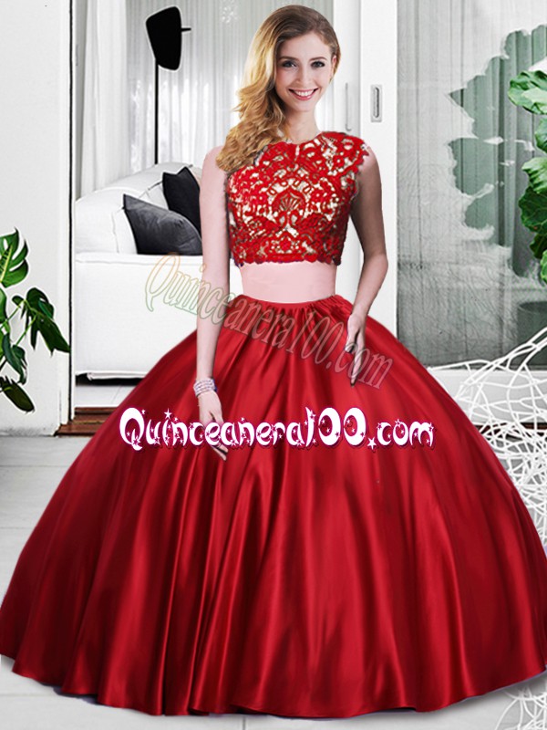 Neckline : ScoopShown Color : Wine RedSilhouette : Two PiecesSleeve Length : sleevelessHemline : floor lengthBack Detail : ZipperFabric : TaffetaEmbellishment : Lace,RuchingOccasion : Military Ball,Sweet 16,QuinceaneraSeason : Spring,Summer,Fall,Winter