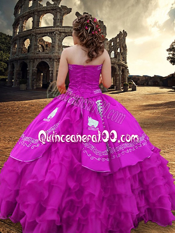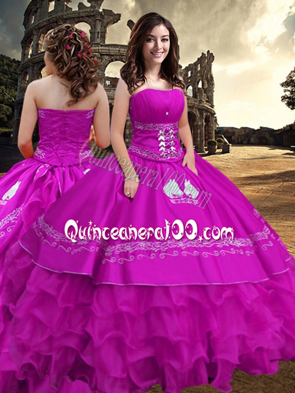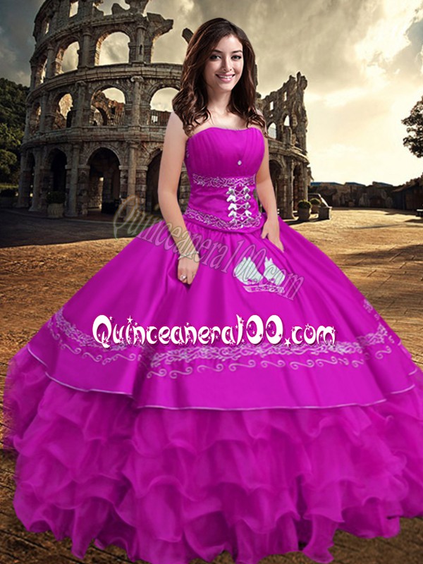 Neckline : StraplessShown Color : FuchsiaSilhouette : Ball GownsSleeve Length : sleevelessHemline : floor lengthBack Detail : ZipperFabric : TaffetaEmbellishment : Embroidery,Ruffled LayersOccasion : Military Ball,Sweet 16,QuinceaneraSeason : Spring,Summer,Fall,Winter
