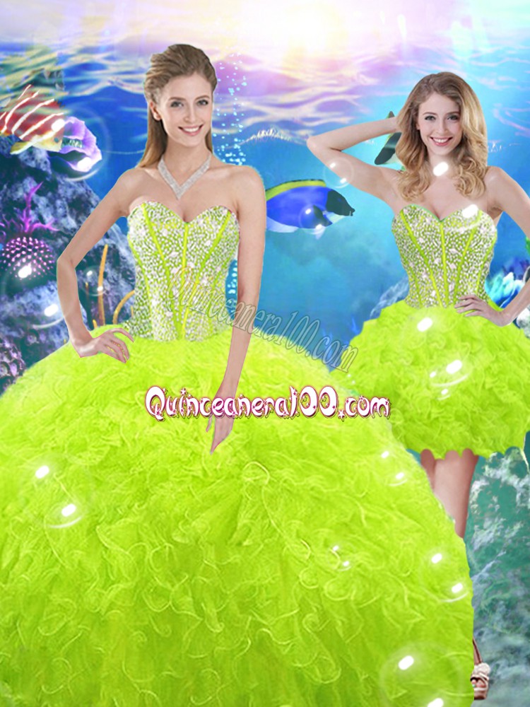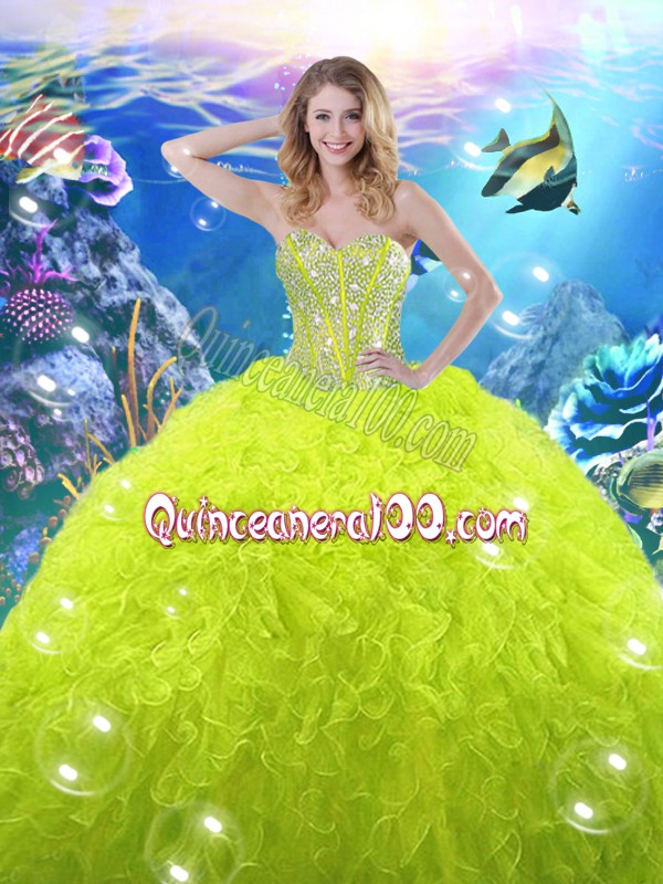 Neckline : SweetheartShown Color : Yellow GreenSilhouette : Ball GownsSleeve Length : sleevelessHemline : floor lengthBack Detail : Lace upFabric : OrganzaEmbellishment : Beading,RufflesOccasion : Military Ball,Sweet 16,QuinceaneraSeason : Spring,Summer,Fall,Winter