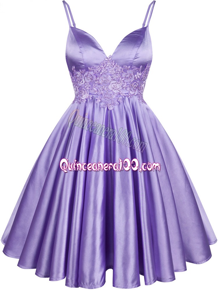 Neckline : Spaghetti strapsShown Color : LilacSilhouette : A-lineSleeve Length : sleevelessHemline : knee lengthBack Detail : Lace upFabric : Elastic Woven SatinEmbellishment : LaceOccasion : Prom,Party,Wedding PartySeason : Spring,Summer,Fall