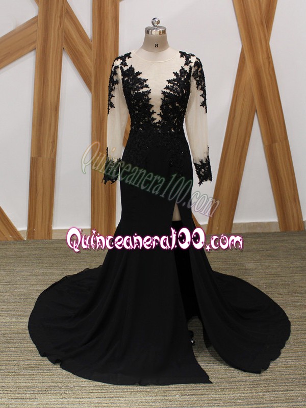 Neckline : ScoopShown Color : BlackSilhouette : MermaidSleeve Length : long sleevesBack Detail : ZipperFabric : ChiffonEmbellishment : Lace,AppliquesOccasion : Prom,Party,Military Ball,BeachSeason : Spring,Summer,Fall,Winter