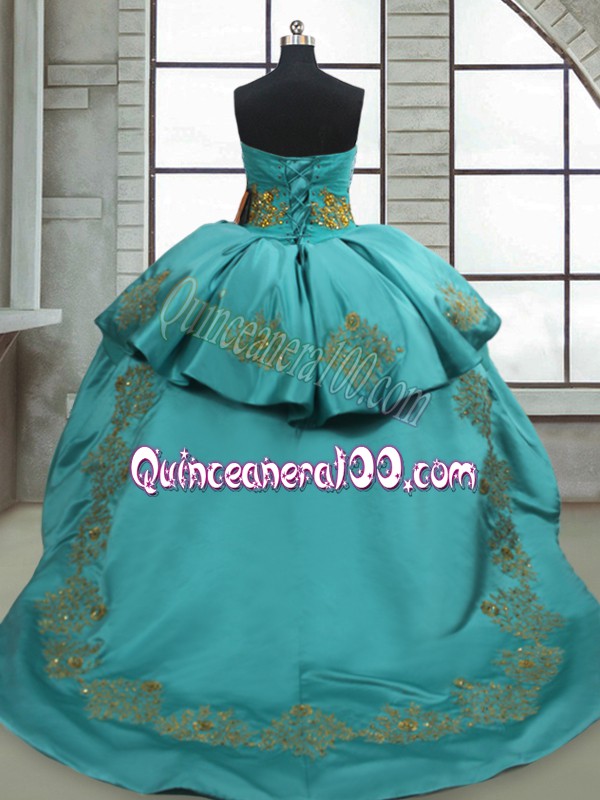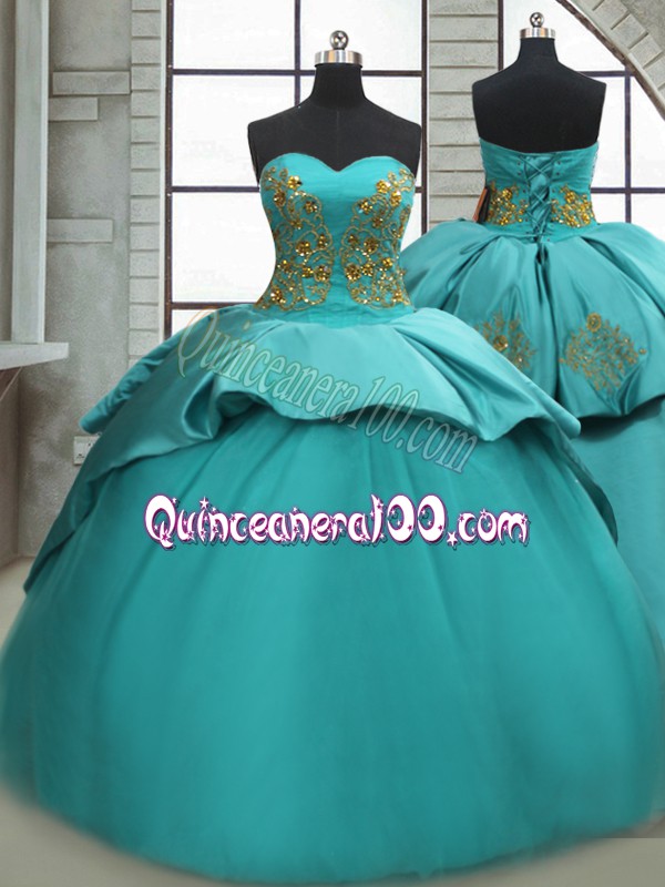 Neckline : SweetheartShown Color : TurquoiseSilhouette : Ball GownsSleeve Length : sleevelessBack Detail : Lace upFabric : SatinEmbellishment : Beading,AppliquesOccasion : Military Ball,Sweet 16,QuinceaneraSeason : Spring,Summer,Fall,Winter