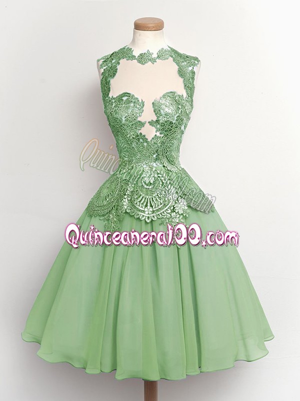 Neckline : High-neckShown Color : GreenSilhouette : A-lineSleeve Length : sleevelessHemline : knee lengthBack Detail : Lace upFabric : ChiffonEmbellishment : LaceOccasion : Prom,Party,Wedding PartySeason : Spring,Summer,Fall