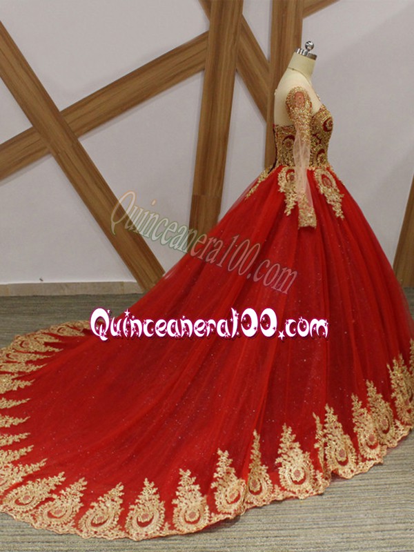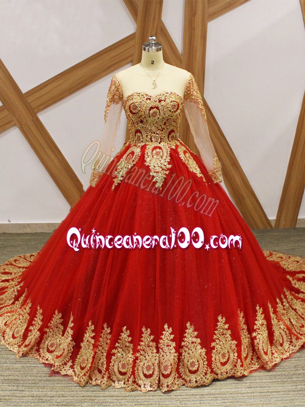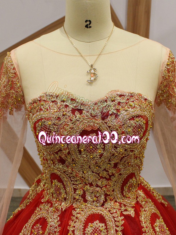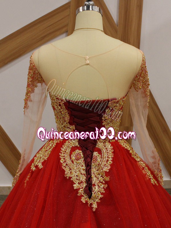 Neckline : ScoopShown Color : Wine RedSilhouette : Ball GownsSleeve Length : long sleevesBack Detail : Lace upFabric : TulleEmbellishment : Beading,AppliquesOccasion : Military Ball,Sweet 16,QuinceaneraSeason : Spring,Summer,Fall,Winter