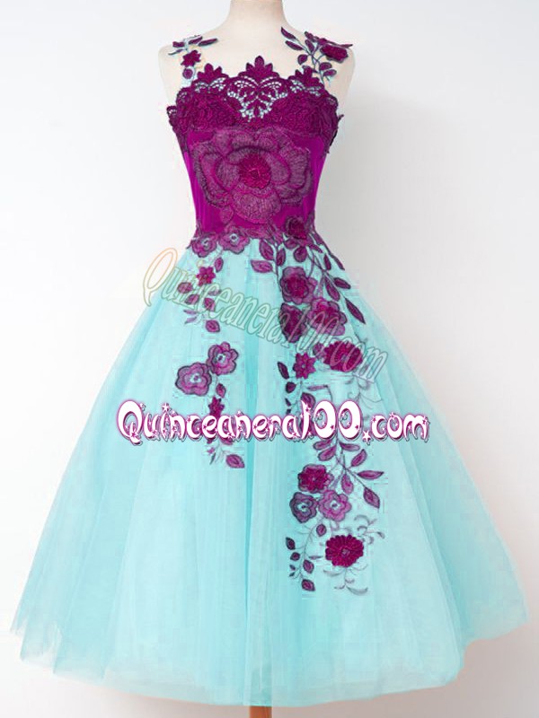Neckline : StrapsShown Color : Aqua BlueSilhouette : A-lineSleeve Length : sleevelessHemline : knee lengthBack Detail : Lace upFabric : TulleEmbellishment : AppliquesOccasion : Prom,Party,Wedding PartySeason : Spring,Summer,Fall