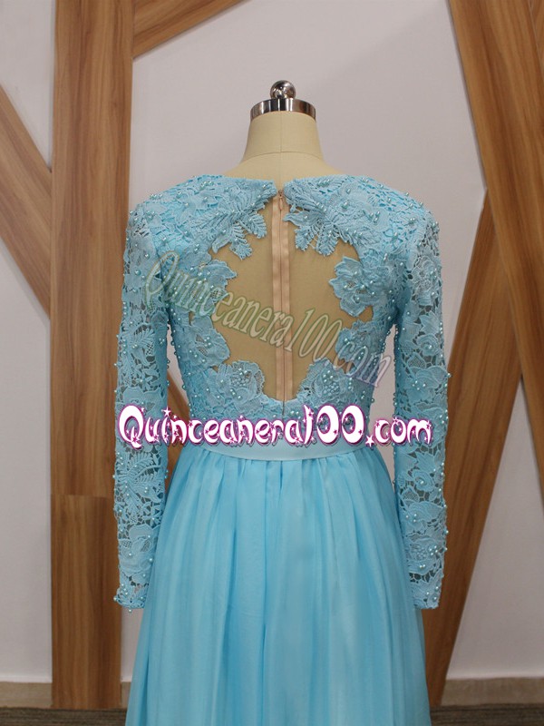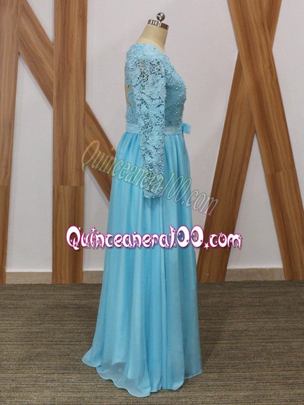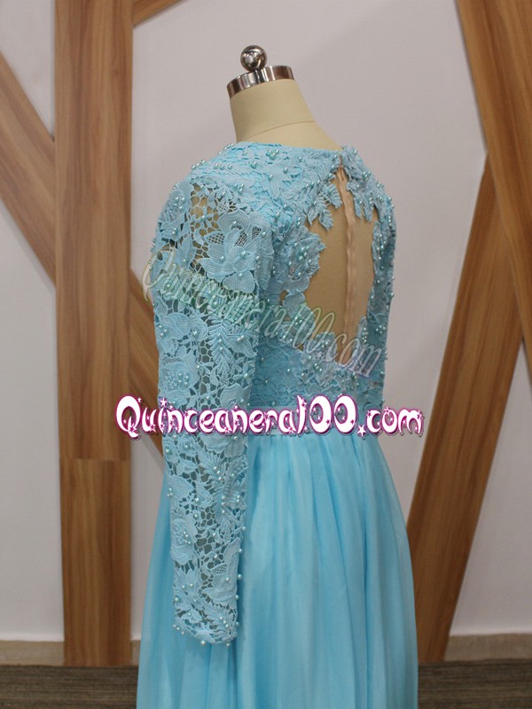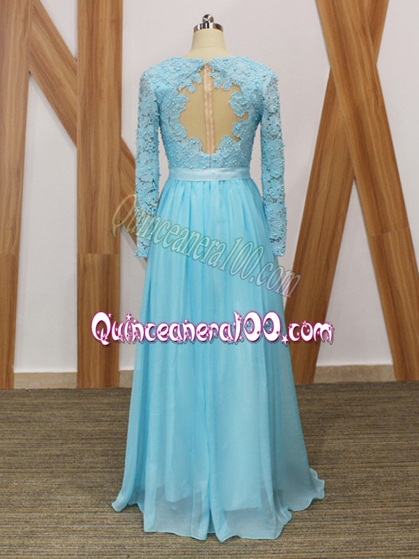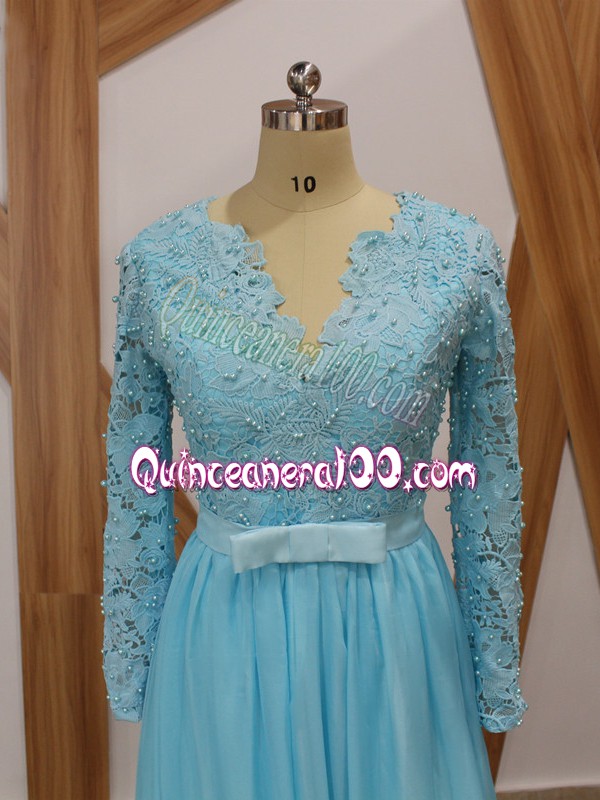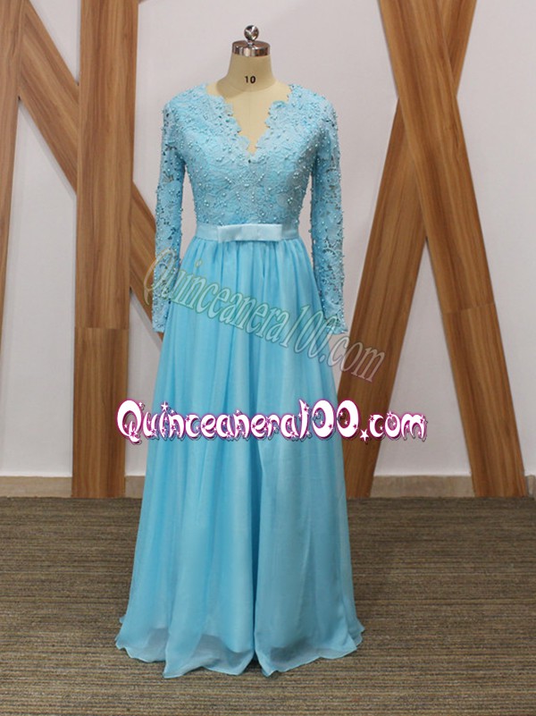 Neckline : V-neckShown Color : Baby BlueSilhouette : EmpireSleeve Length : long sleevesHemline : floor lengthBack Detail : BacklessFabric : ChiffonEmbellishment : LaceOccasion : Prom,Military Ball,Sweet 16Season : Spring,Summer,Fall,Winter