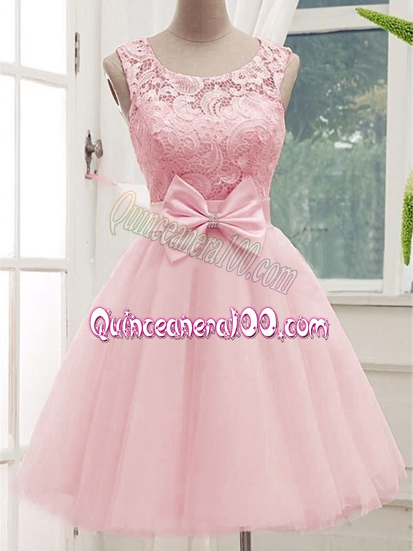 Neckline : ScoopShown Color : Baby PinkSilhouette : A-lineSleeve Length : sleevelessHemline : knee lengthBack Detail : Lace upFabric : TulleEmbellishment : Lace,BowknotOccasion : Prom,Party,Wedding PartySeason : Spring,Summer,Fall