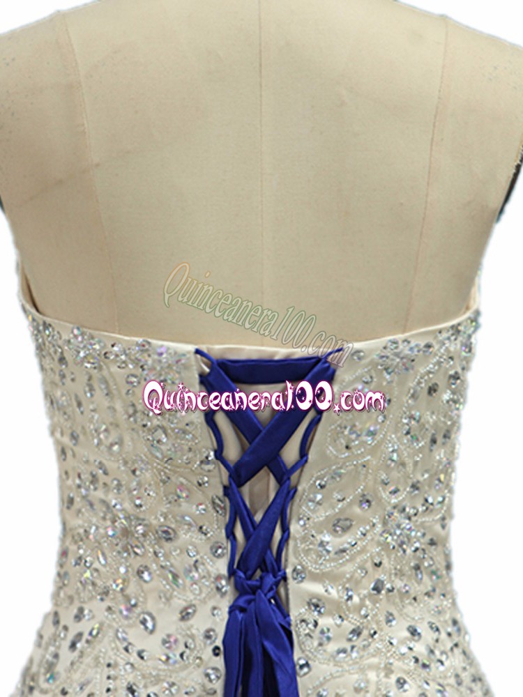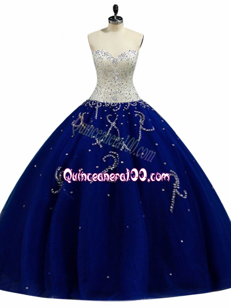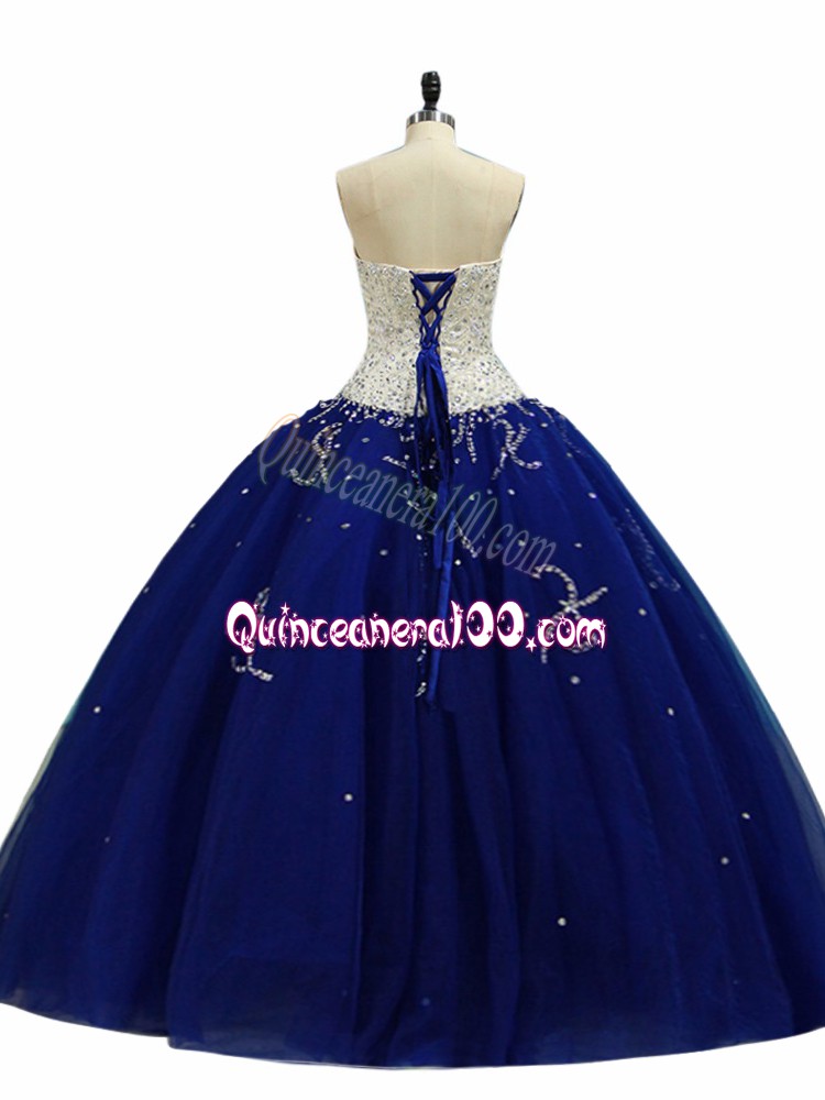 Neckline : SweetheartShown Color : Royal BlueSilhouette : Ball GownsSleeve Length : sleevelessHemline : floor lengthBack Detail : Lace upFabric : TulleEmbellishment : BeadingOccasion : Military Ball,Sweet 16,QuinceaneraSeason : Spring,Summer,Fall,Winter