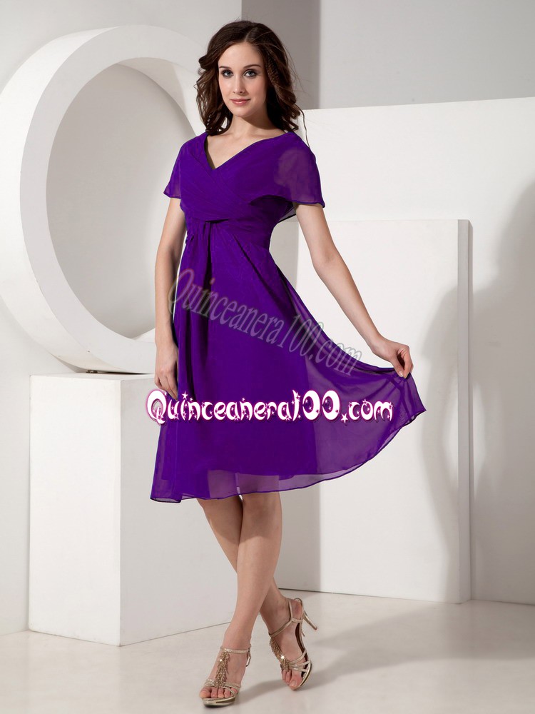 Neckline : V-neckShown Color : PurpleSilhouette : EmpireSleeve Length : short sleevesHemline : knee lengthBack Detail : ZipperFabric : ChiffonEmbellishment : RuchingOccasion : Prom,PartySeason : Spring,Summer,Fall