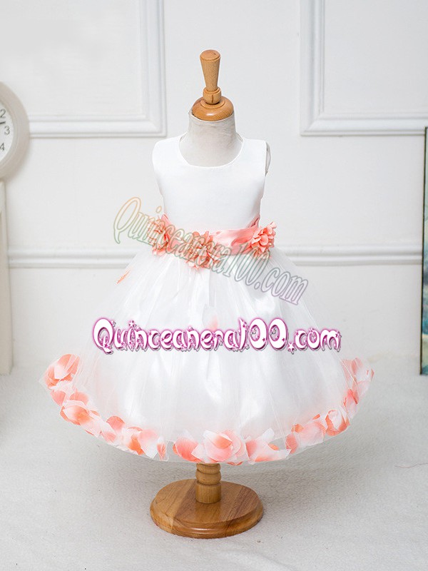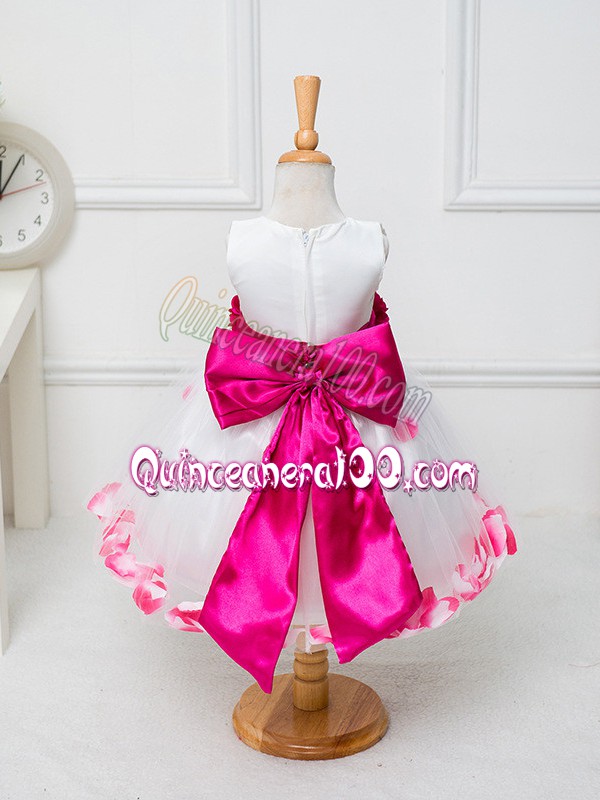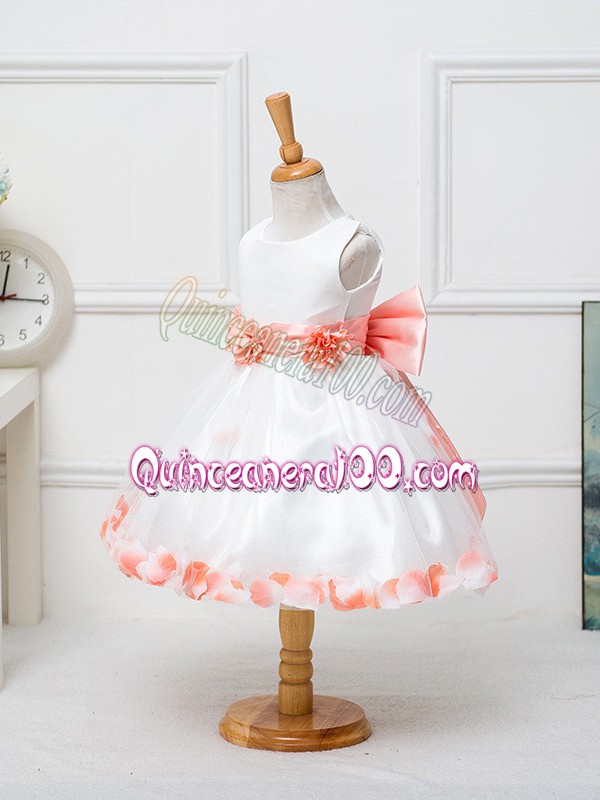Neckline : ScoopShown Color : WhiteSilhouette : Ball GownsSleeve Length : sleevelessHemline : knee lengthBack Detail : ZipperFabric : TulleEmbellishment : Appliques,Bowknot,Hand Made FlowerOccasion : Wedding PartySeason : Spring,Summer,Fall