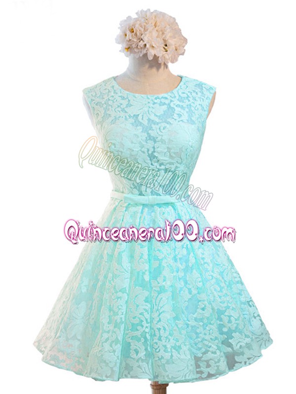 Neckline : Scoop Shown Color : Aqua Blue Silhouette : A-line Sleeve Length : sleeveless Hemline : knee length Back Detail : Lace up Fabric : Lace Embellishment : Belt Occasion : Prom,Party,Wedding Party Season : Spring,Summer,Fall