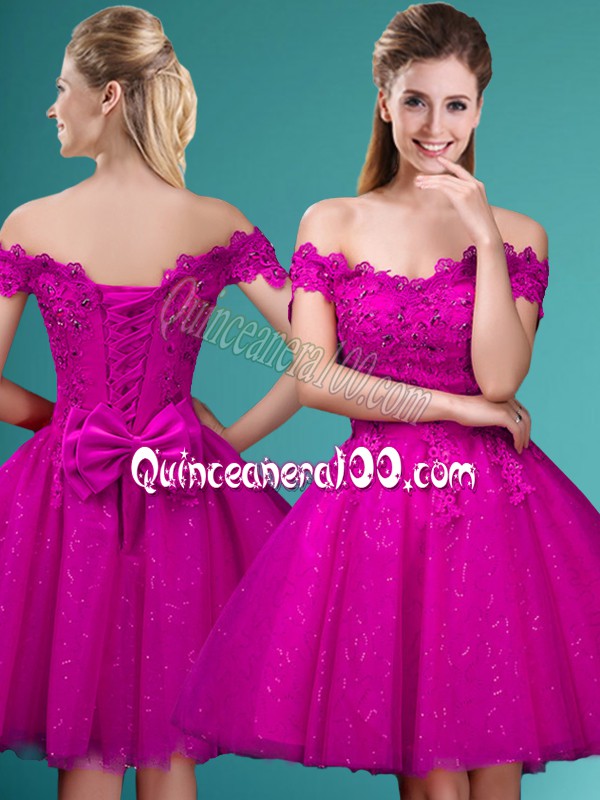 Neckline : Off the shoulderShown Color : FuchsiaSilhouette : A-lineSleeve Length : cap sleevesHemline : knee lengthBack Detail : Lace upFabric : TulleEmbellishment : Lace,BeltOccasion : Prom,PartySeason : Spring,Summer,Fall