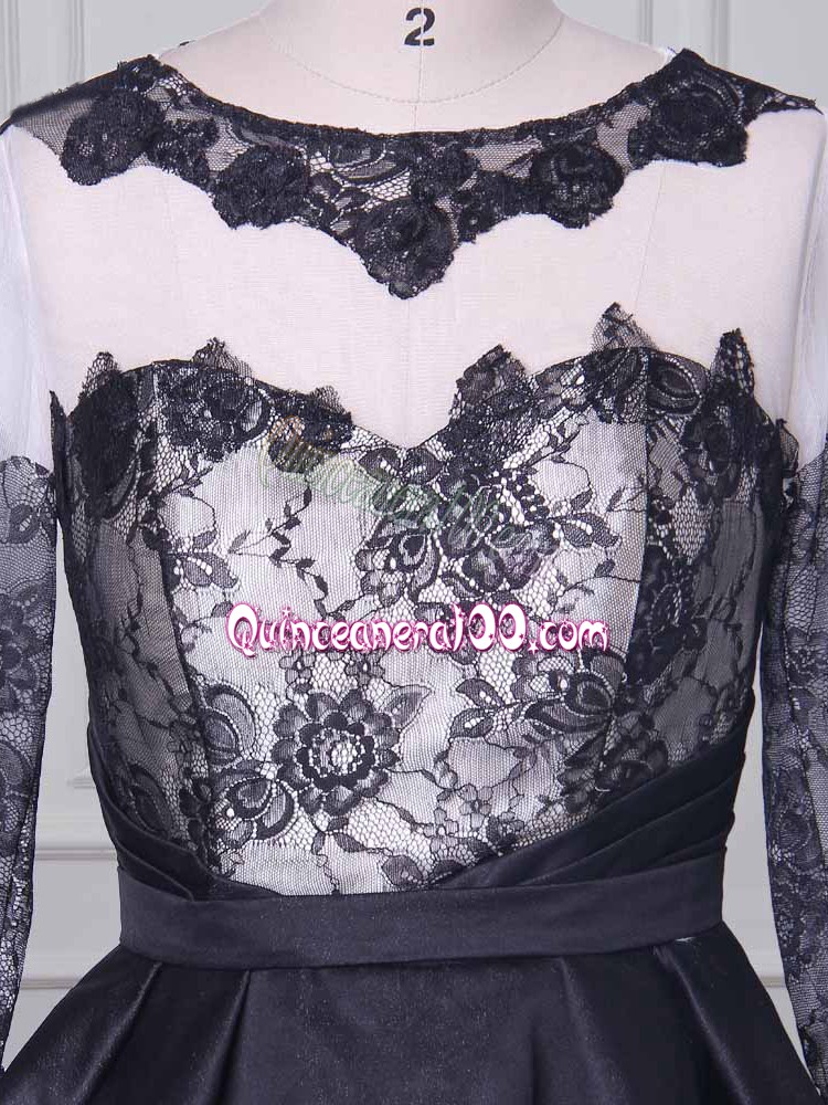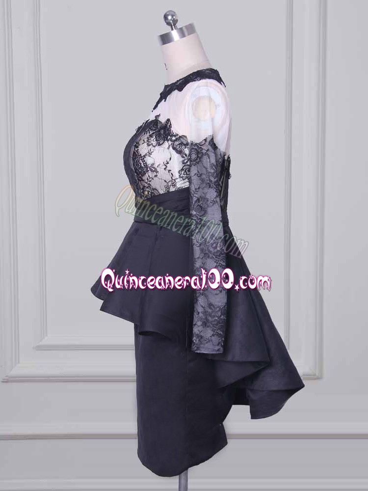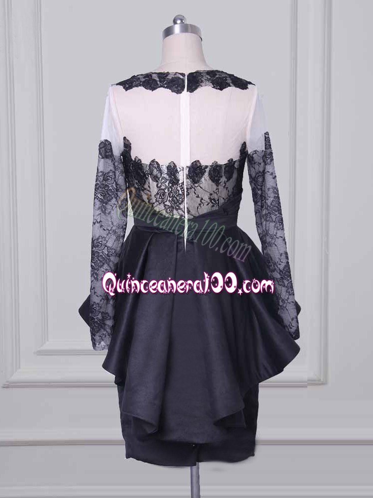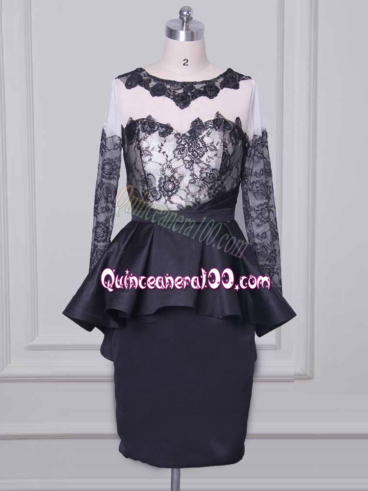 Neckline : ScoopShown Color : BlackSilhouette : Column/SheathSleeve Length : long sleevesHemline : mini lengthBack Detail : ZipperFabric : SatinEmbellishment : Lace,AppliquesOccasion : Prom,PartySeason : Spring,Summer,Fall