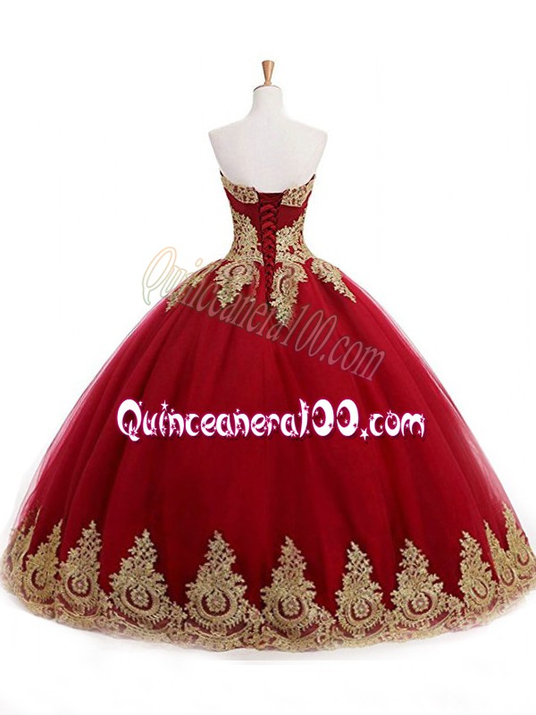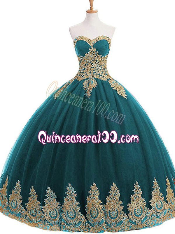 Neckline : SweetheartShown Color : Teal Silhouette : Ball GownsSleeve Length : sleevelessHemline : floor lengthBack Detail : Lace upFabric : TulleEmbellishment : AppliquesOccasion : Sweet 16,QuinceaneraSeason : Spring,Summer,Fall,Winter