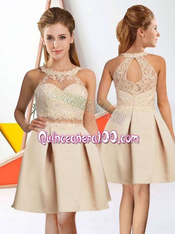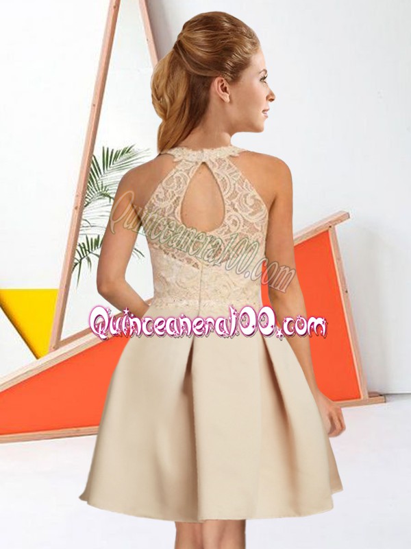 Neckline : Halter topShown Color : ChampagneSilhouette : A-lineSleeve Length : sleevelessHemline : knee lengthBack Detail : ZipperFabric : ChiffonEmbellishment : LaceOccasion : Prom,PartySeason : Spring,Summer,Fall