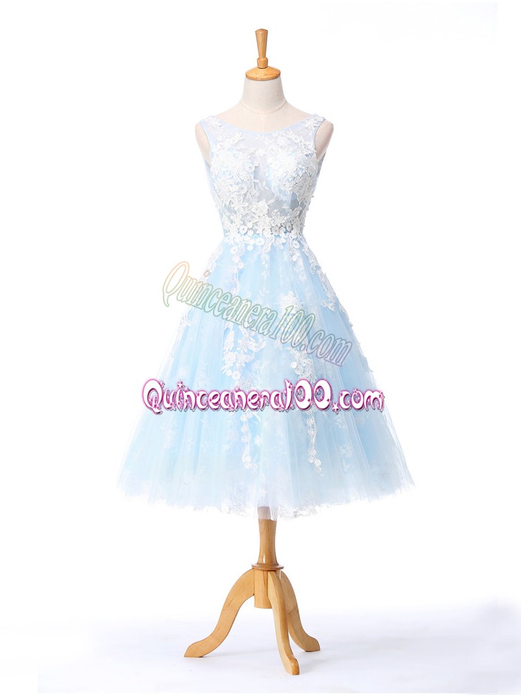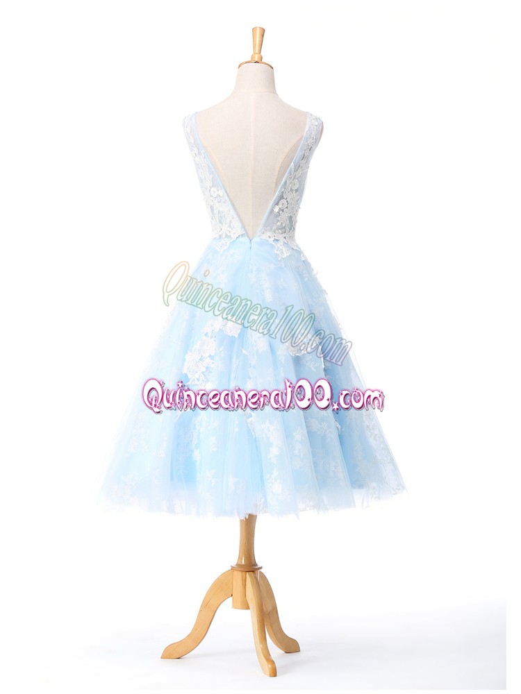 Neckline : ScoopShown Color : Light BlueSilhouette : A-lineSleeve Length : sleevelessHemline : knee lengthBack Detail : BacklessFabric : TulleEmbellishment : AppliquesOccasion : Prom,Party,Wedding PartySeason : Spring,Summer,Fall