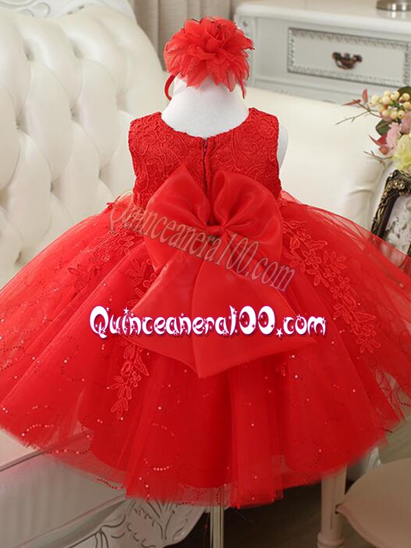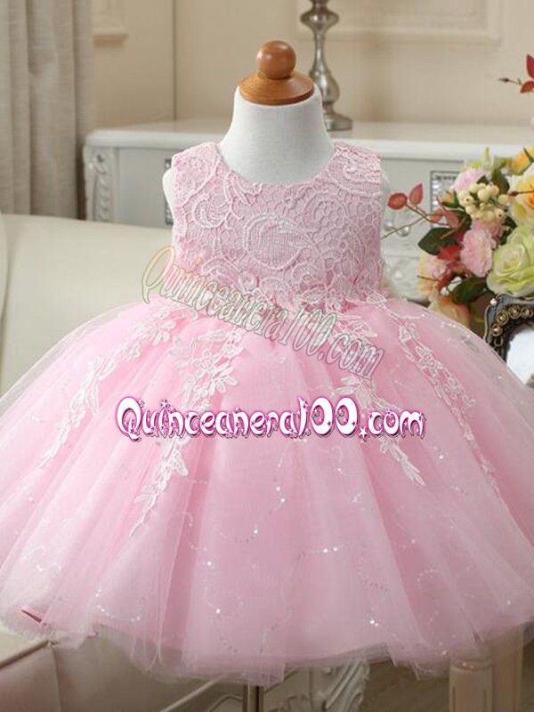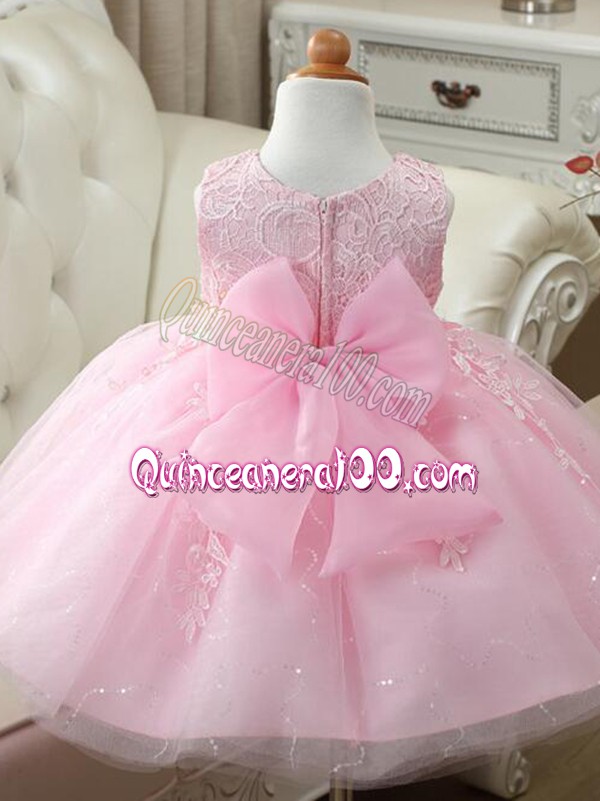 Neckline : ScoopShown Color : Baby PinkSilhouette : Ball GownsSleeve Length : sleevelessHemline : knee lengthBack Detail : ZipperFabric : TulleEmbellishment : Appliques,BowknotOccasion : Wedding PartySeason : Spring,Summer,Fall