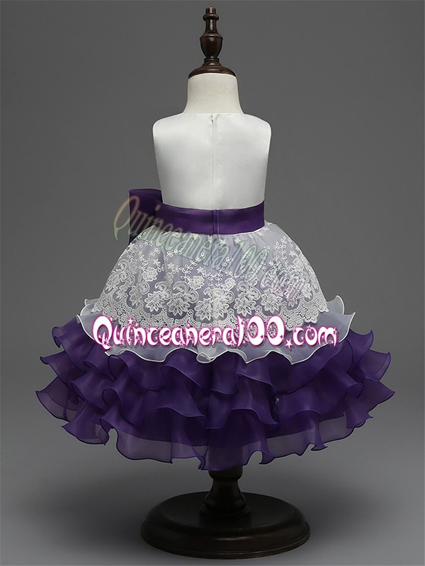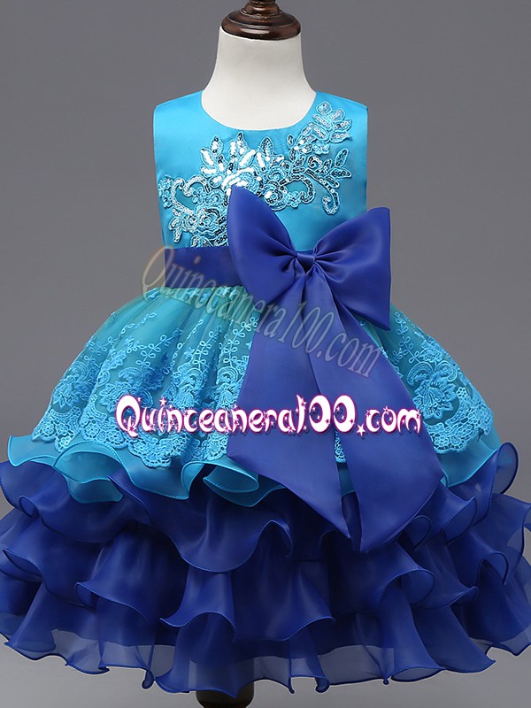 Neckline : ScoopShown Color : Royal BlueSilhouette : Ball GownsSleeve Length : sleevelessHemline : tea lengthBack Detail : ZipperFabric : OrganzaEmbellishment : Lace,Ruffled Layers,BowknotOccasion : Wedding PartySeason : Spring,Summer,Fall,Winter