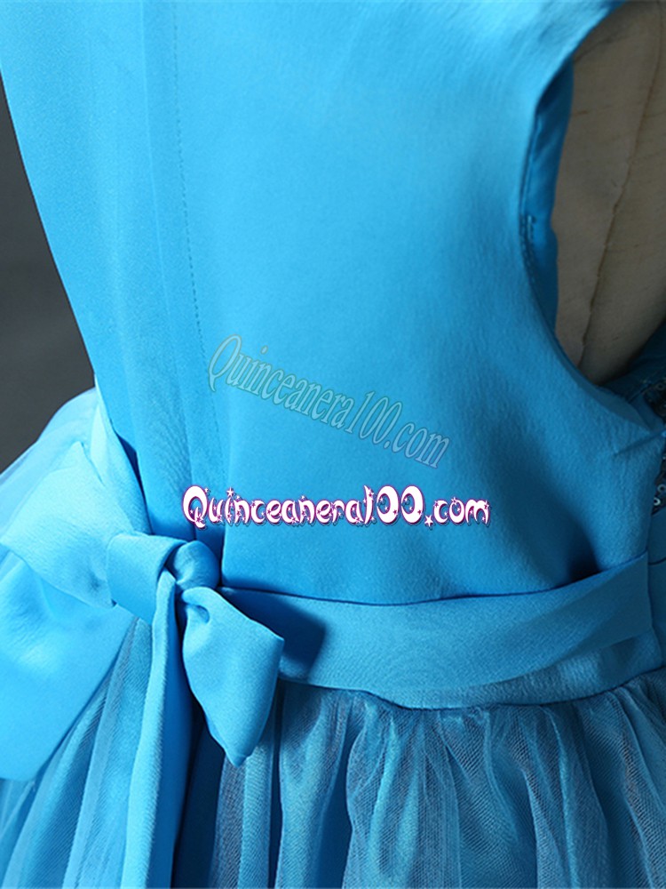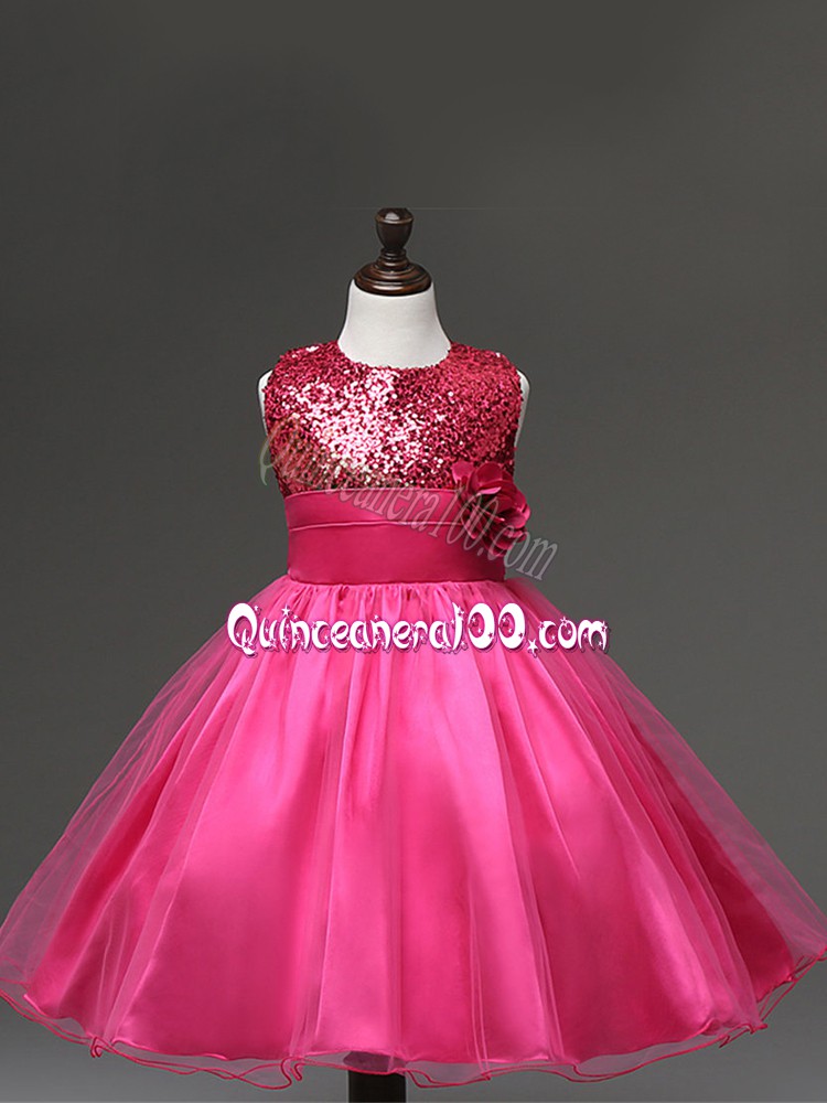 Neckline : ScoopShown Color : Hot PinkSilhouette : Ball GownsSleeve Length : sleevelessHemline : knee lengthBack Detail : ZipperFabric : TulleEmbellishment : Sequins,Hand Made FlowerOccasion : Wedding PartySeason : Spring,Summer,Fall