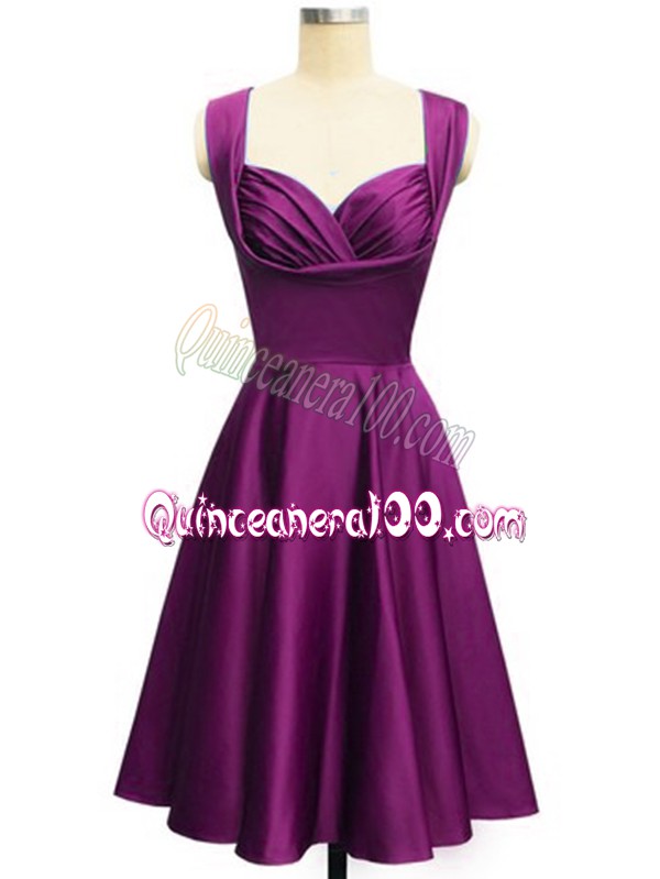 Neckline : StrapsShown Color : PurpleSilhouette : EmpireSleeve Length : sleevelessHemline : knee lengthBack Detail : Side zipperFabric : TaffetaEmbellishment : RuchingOccasion : Prom,Party,Wedding PartySeason : Spring,Summer,Fall