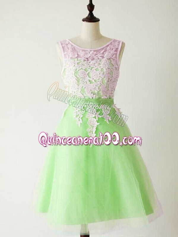 Neckline : ScoopShown Color : Spring GreenSilhouette : A-lineSleeve Length : sleevelessHemline : knee lengthBack Detail : Lace upFabric : TulleEmbellishment : LaceOccasion : Prom,Party,Wedding PartySeason : Spring,Summer,Fall