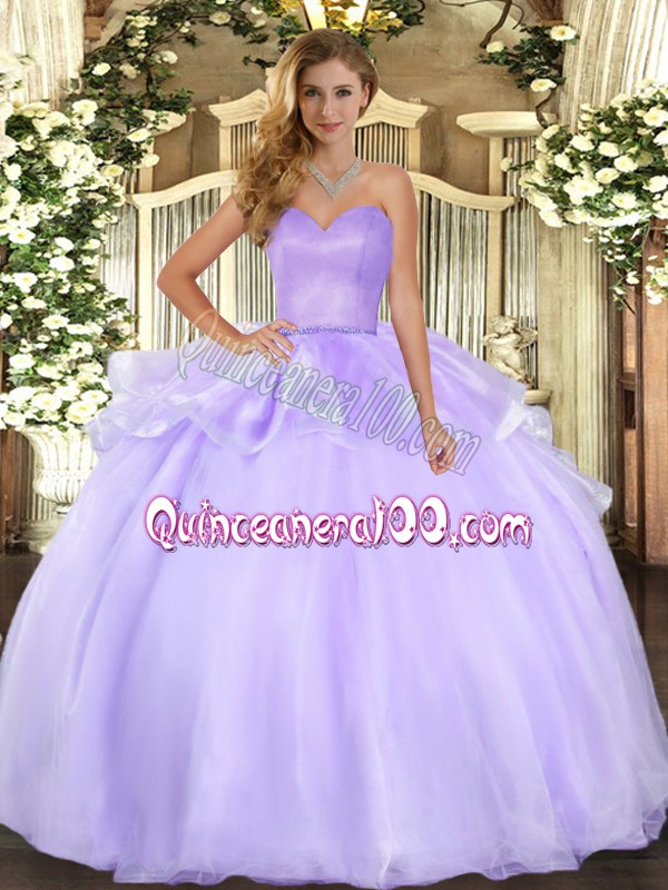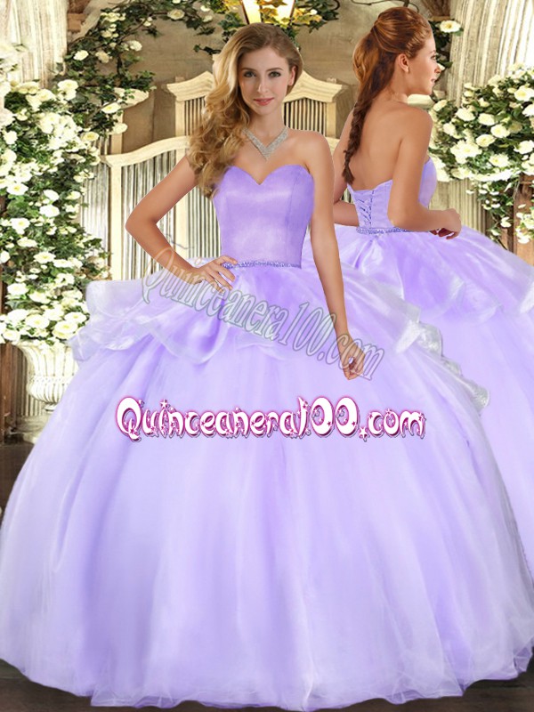 Neckline : SweetheartShown Color : LavenderSilhouette : Ball GownsSleeve Length : sleevelessHemline : floor lengthBack Detail : Lace upFabric : OrganzaEmbellishment : Beading,RufflesOccasion : Military Ball,Sweet 16,QuinceaneraSeason : Spring,Summer,Fall,Winter
