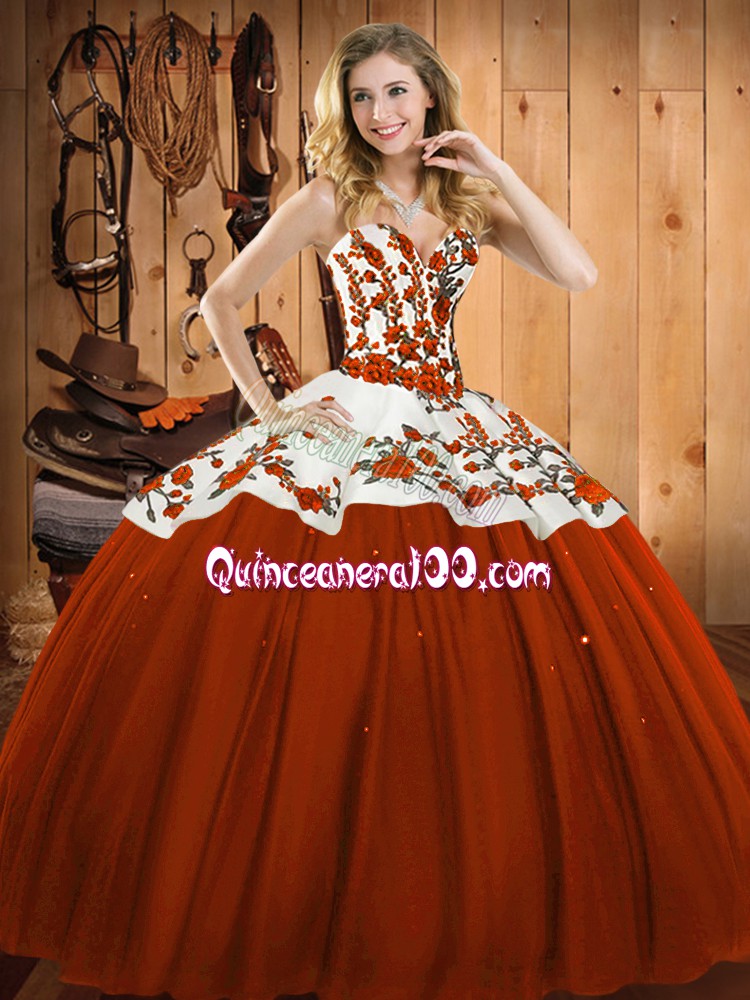 Neckline : SweetheartShown Color : Rust RedSilhouette : Ball GownsSleeve Length : sleevelessHemline : floor lengthBack Detail : Lace upFabric : Satin,TulleEmbellishment : EmbroideryOccasion : Military Ball,Sweet 16,QuinceaneraSeason : Spring,Summer,Fall,Winter