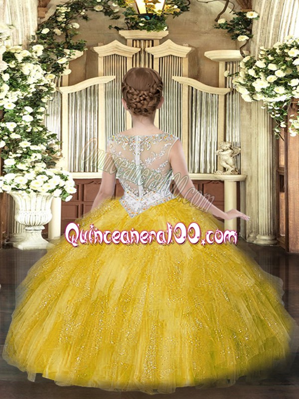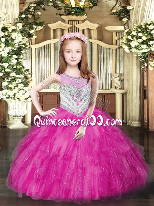 Neckline : ScoopShown Color : FuchsiaSilhouette : Ball GownsSleeve Length : sleevelessHemline : floor lengthBack Detail : ZipperFabric : TulleEmbellishment : Beading,RufflesOccasion : Party,QuinceaneraSeason : Spring,Summer,Fall,Winter