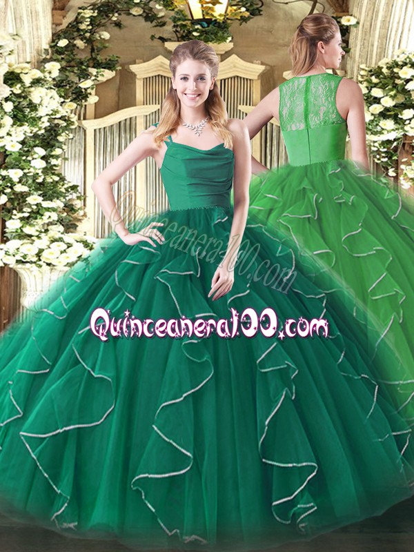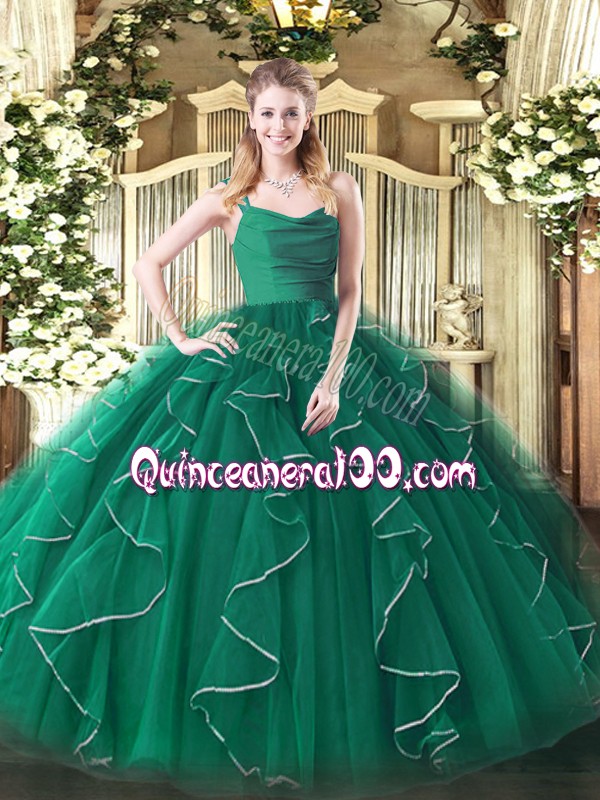 Neckline : StrapsShown Color : Peacock GreenSilhouette : Ball GownsSleeve Length : sleevelessHemline : floor lengthBack Detail : ZipperFabric : OrganzaEmbellishment : RufflesOccasion : Military Ball,Sweet 16,QuinceaneraSeason : Spring,Summer,Fall,Winter