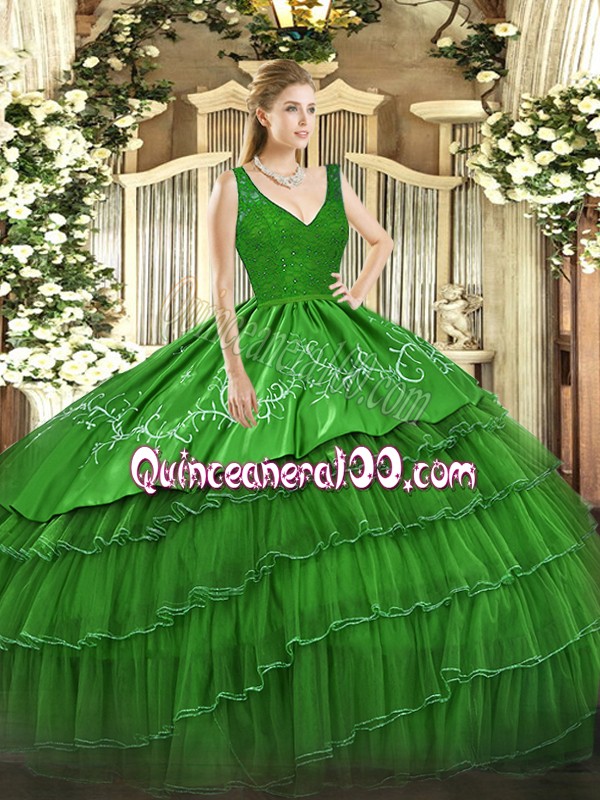 Ball Gowns Sweet 16 Quinceanera Dress Green V-neck Satin and Tulle Sleeveless Floor Length Zipper