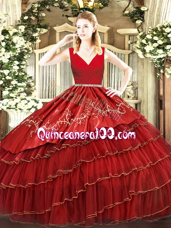 Neckline : V-neckShown Color : Wine RedSilhouette : Ball GownsSleeve Length : sleevelessHemline : floor lengthBack Detail : ZipperFabric : OrganzaEmbellishment : Embroidery,Ruffled LayersOccasion : Military Ball,Sweet 16,QuinceaneraSeason : Spring,Summer,Fall,Winter