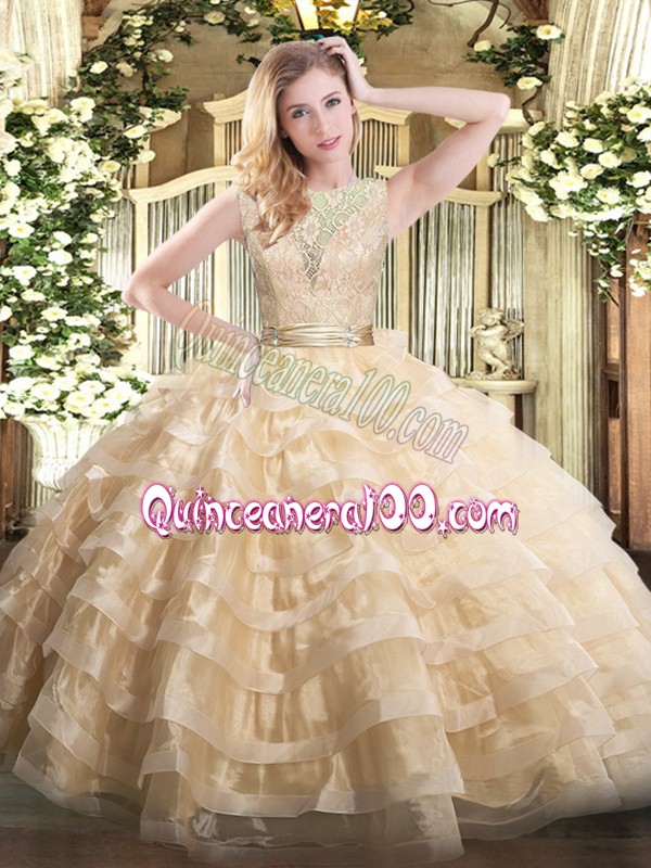 Neckline : ScoopShown Color : ChampagneSilhouette : Ball GownsSleeve Length : sleevelessHemline : floor lengthBack Detail : BacklessFabric : OrganzaEmbellishment : Lace,Ruffled LayersOccasion : Military Ball,Sweet 16,QuinceaneraSeason : Spring,Summer,Fall,Winter