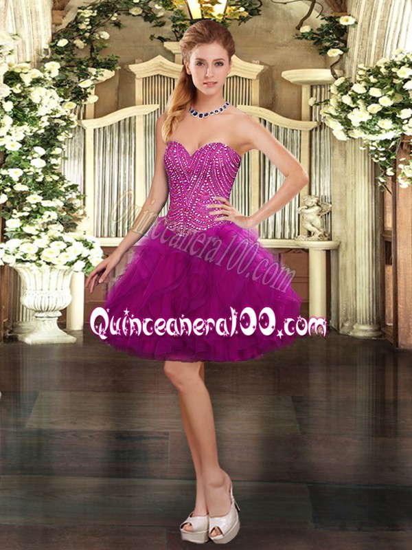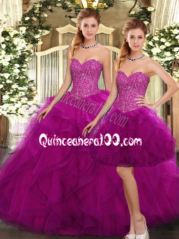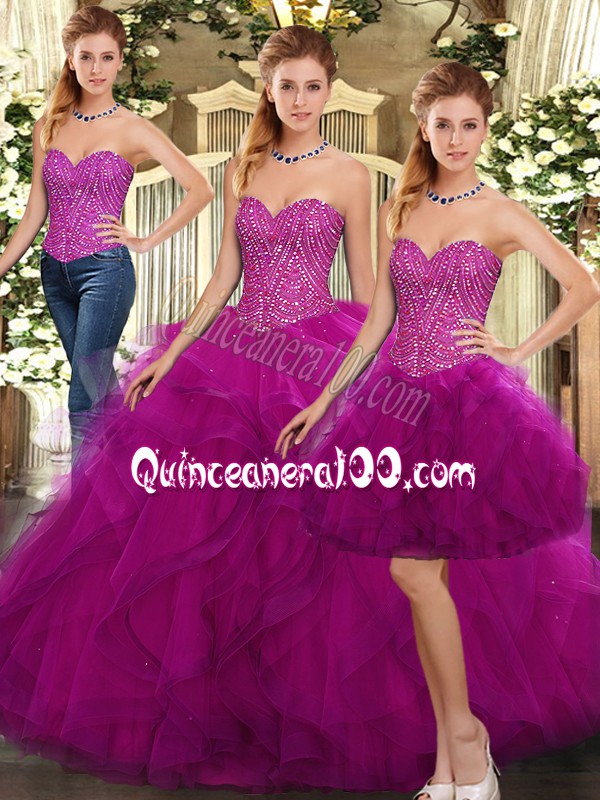 Neckline : SweetheartShown Color : FuchsiaSilhouette : Three PiecesSleeve Length : sleevelessHemline : floor lengthBack Detail : Lace upFabric : OrganzaEmbellishment : Beading,RufflesOccasion : Military Ball,Sweet 16,QuinceaneraSeason : Spring,Summer,Fall,Winter